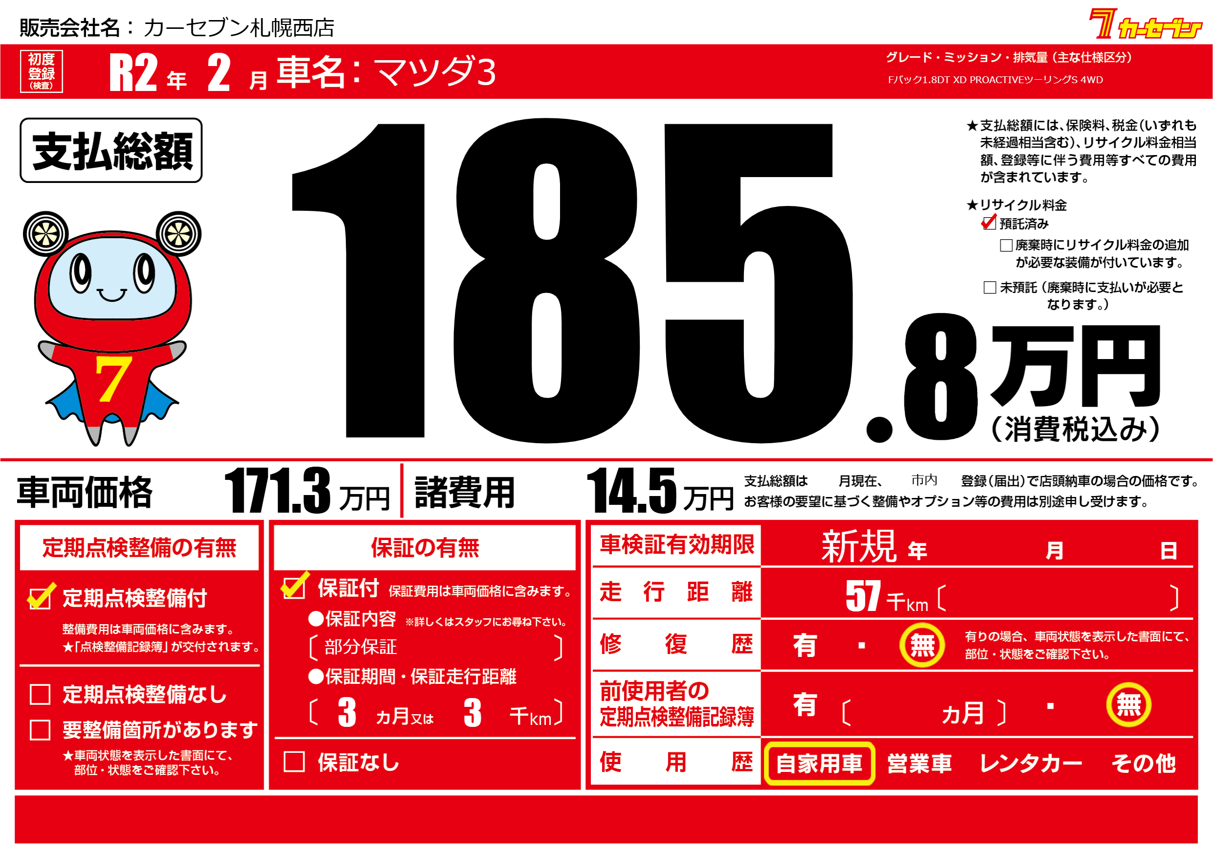 | 車名 | マツダ3 | グレード ミッション 排気量 |