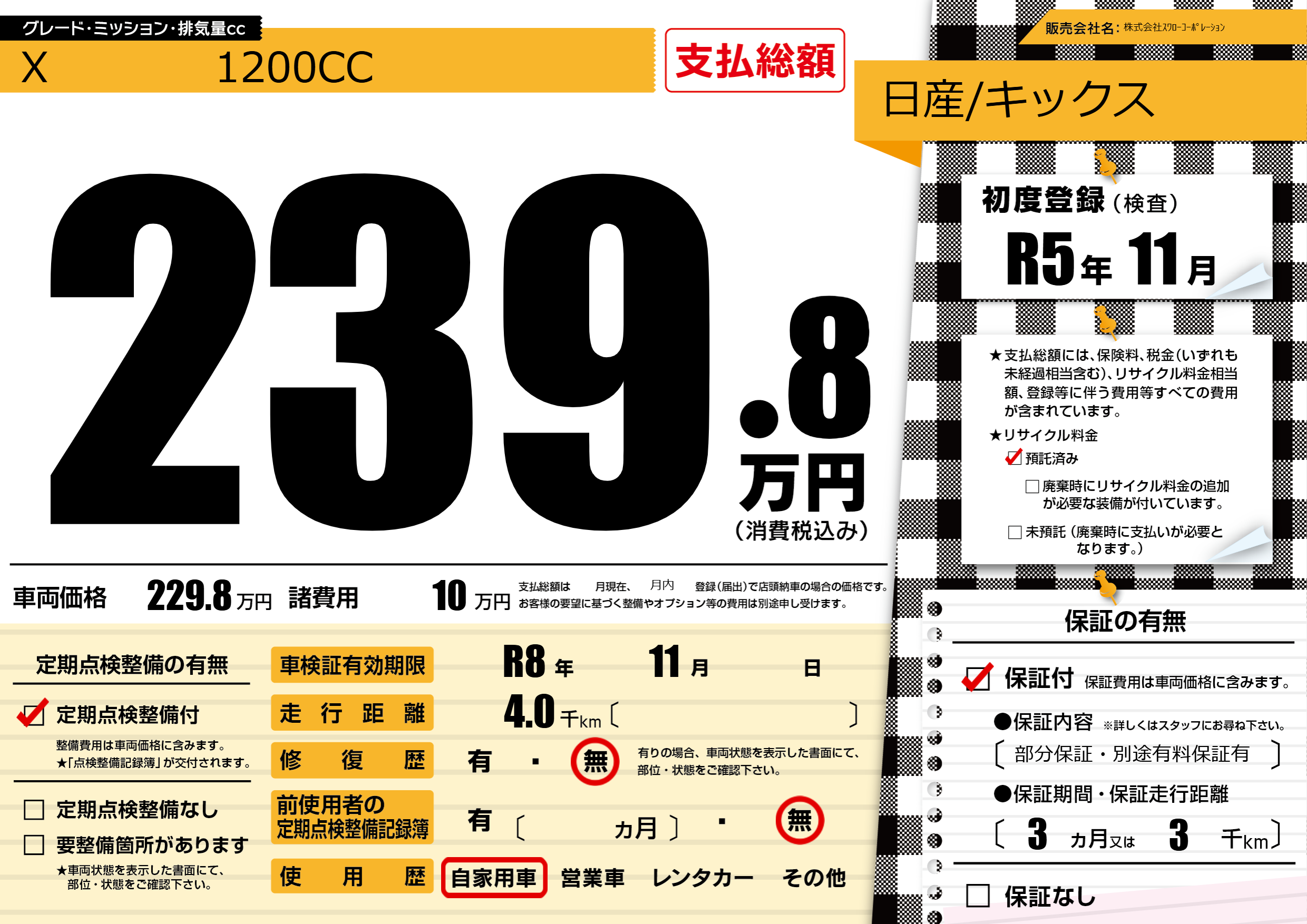 | 車名 | 日産/キックス | グレード ミッション 排気量 |