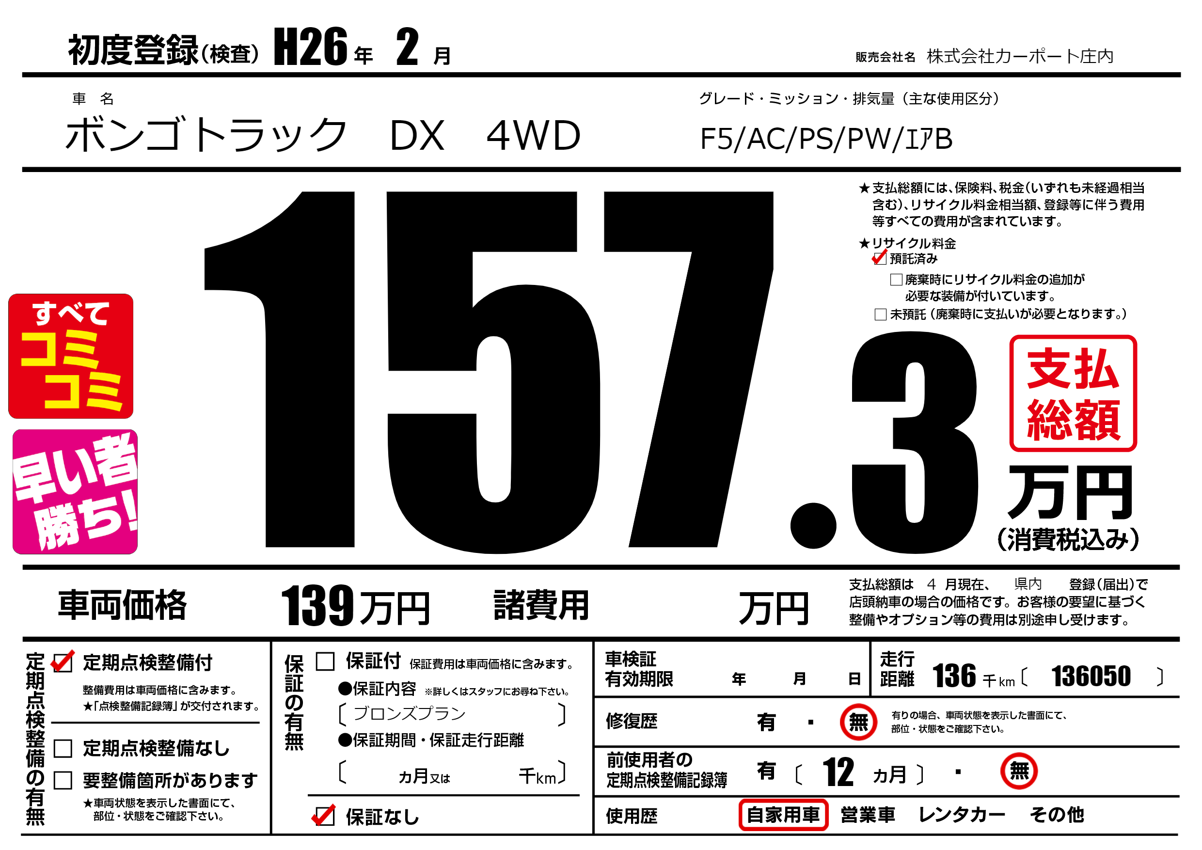 | 走行キロ | 13.6万km | 初年度登録 | H26年2月 |