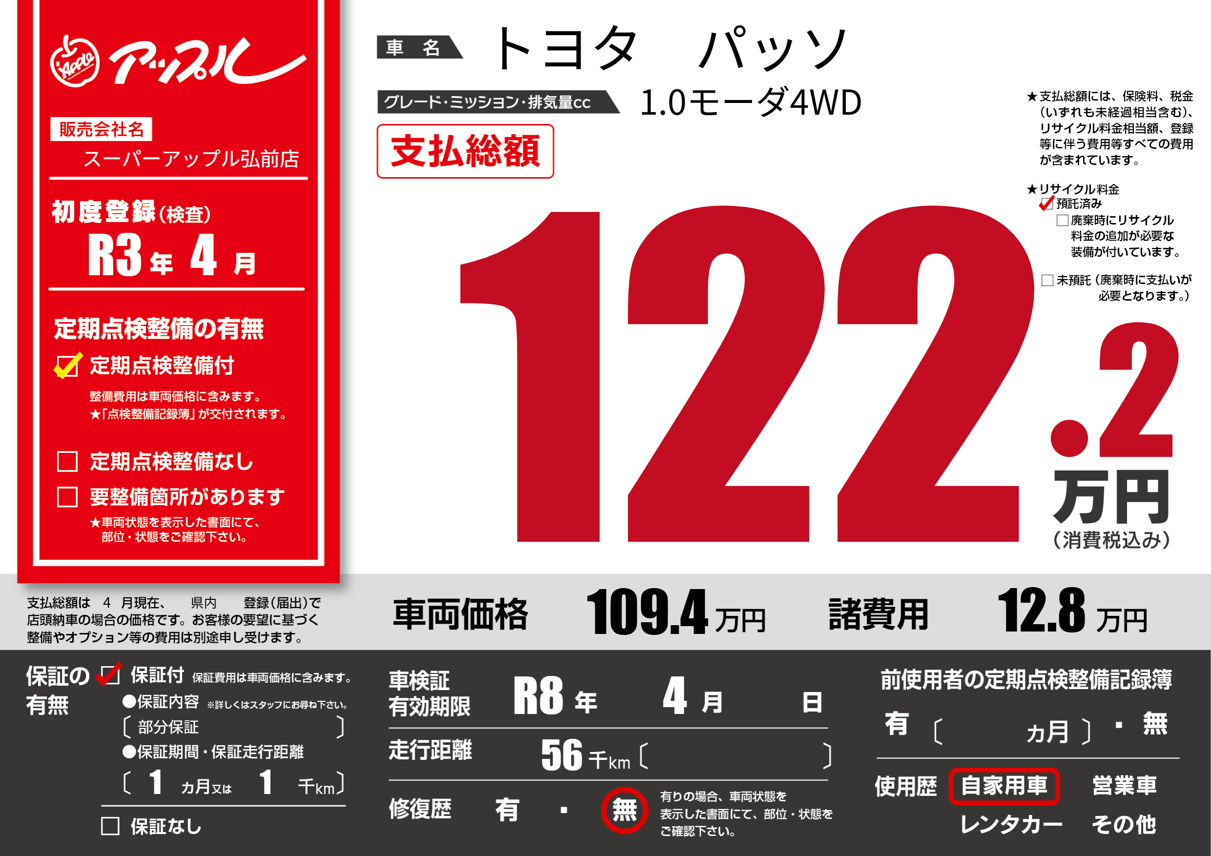| 車名 | トヨタ パッソ | グレード ミッション 排気量 |