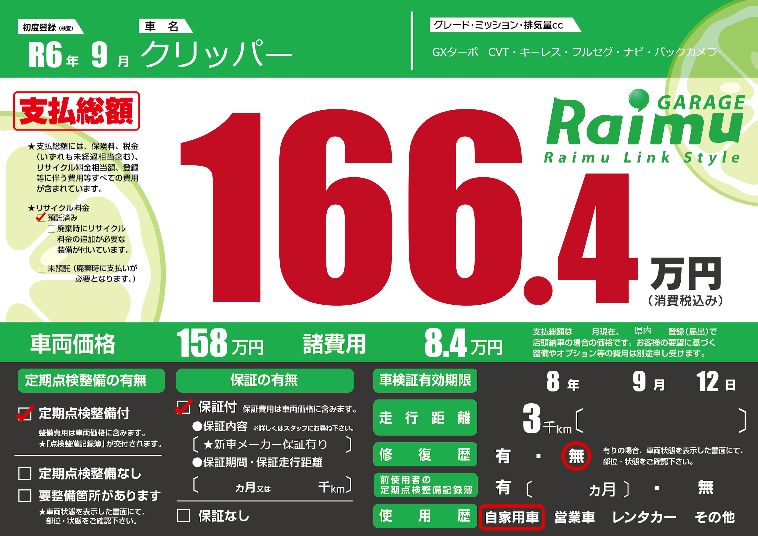 | 走行キロ | 0.3万km | 初年度登録 | R6年9月 |