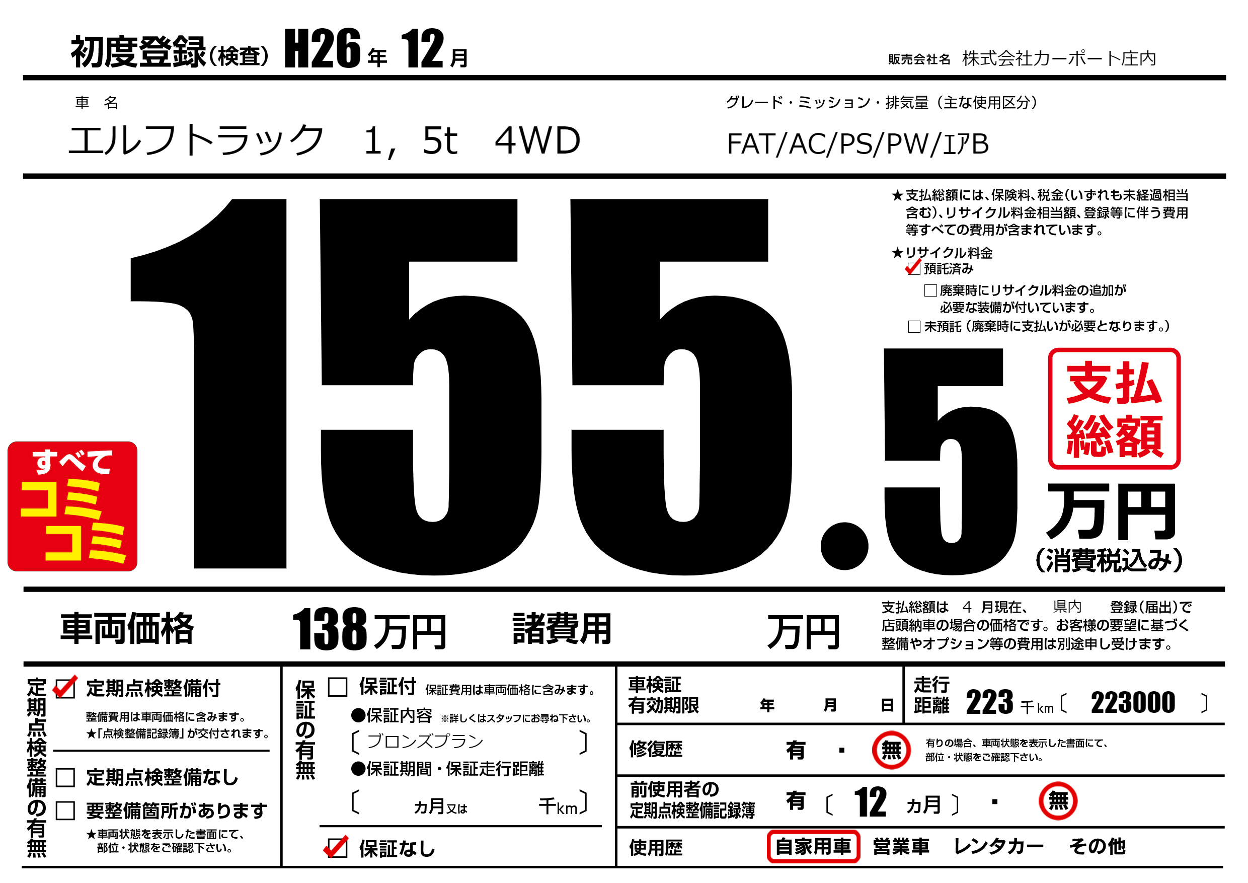 | 車名 | エルフトラック 1,5t 4WD | グレード ミッション 排気量 |