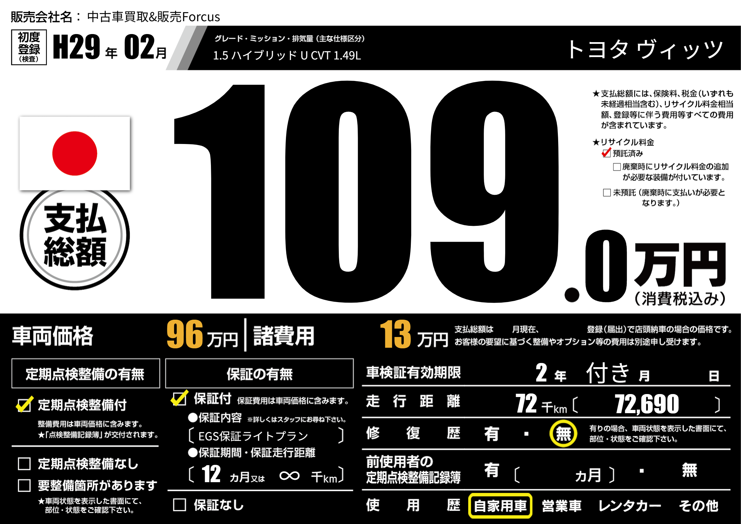 | 車名 | トヨタ ヴィッツ | グレード ミッション 排気量 |