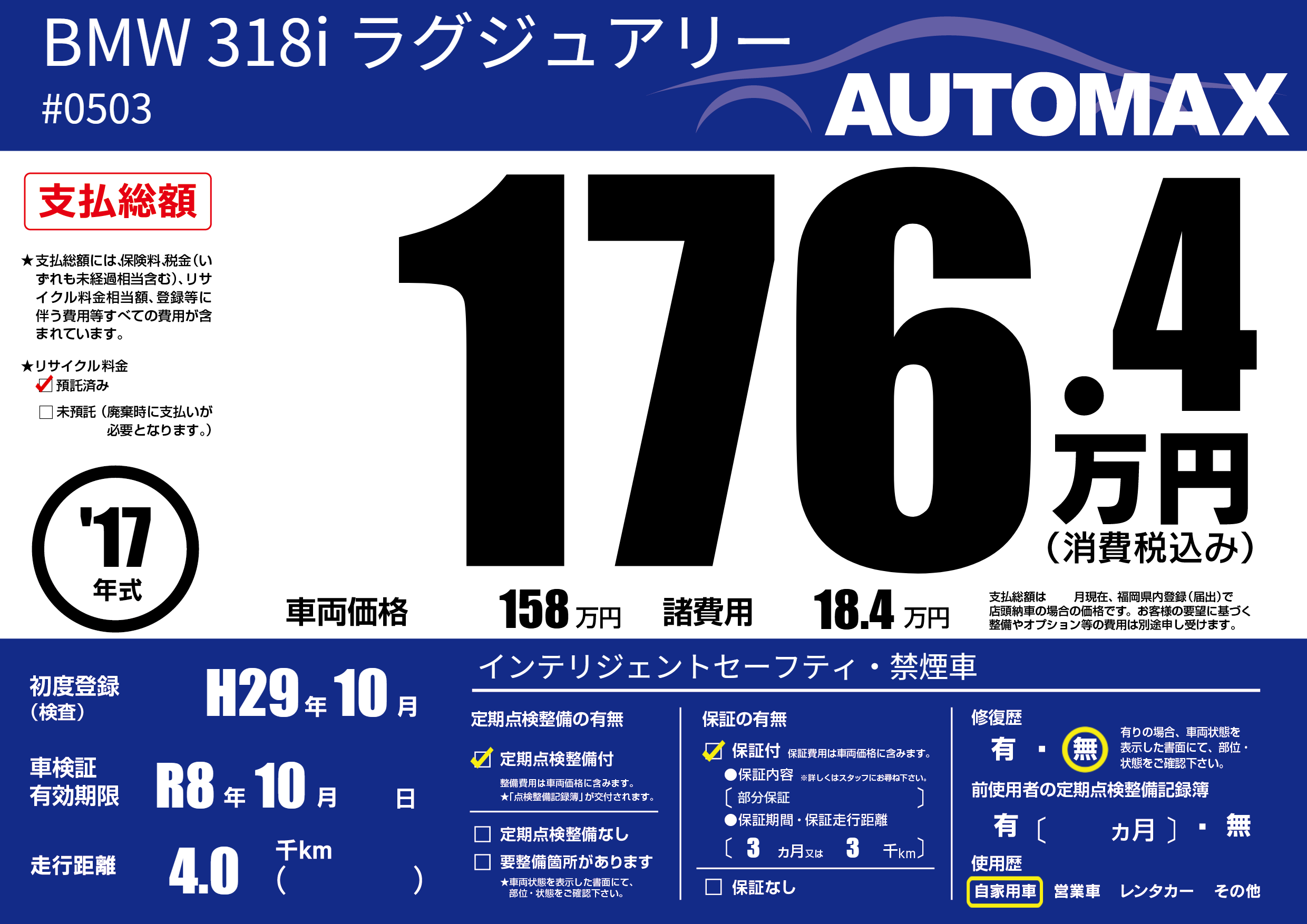 | 車名 | BMW 318i ラグジュアリー | グレード ミッション 排気量 |
