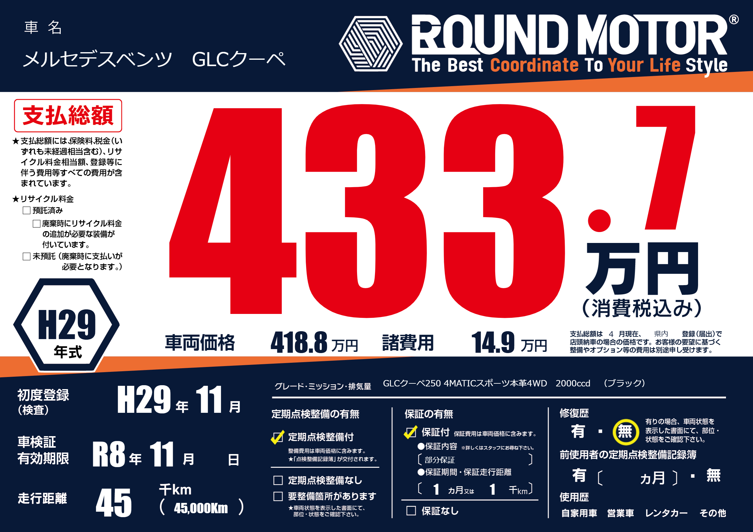 | 車名 | メルセデスベンツ GLCクーペ | グレード ミッション 排気量 |