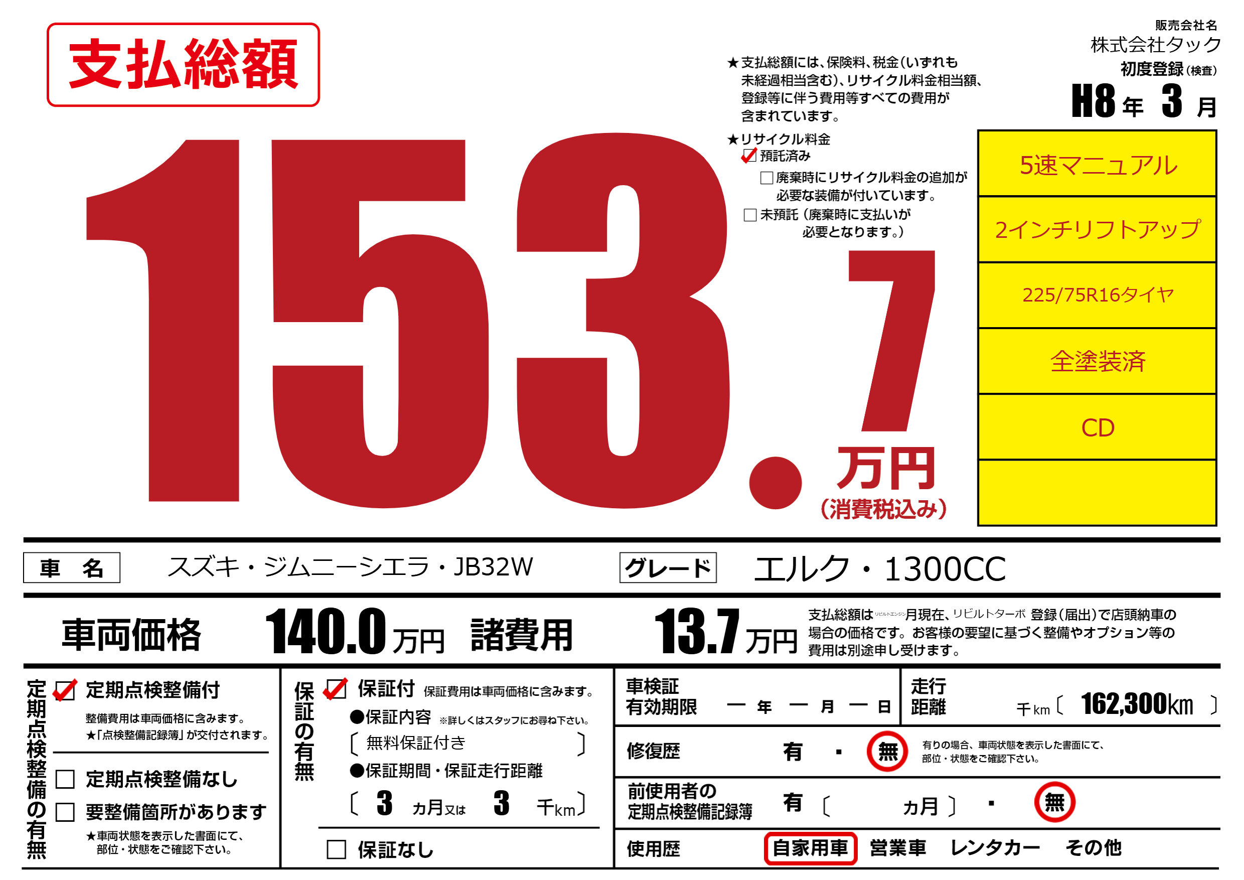 | 車名 | スズキ・ジムニーシエラ・JB32W | グレード ミッション 排気量 |