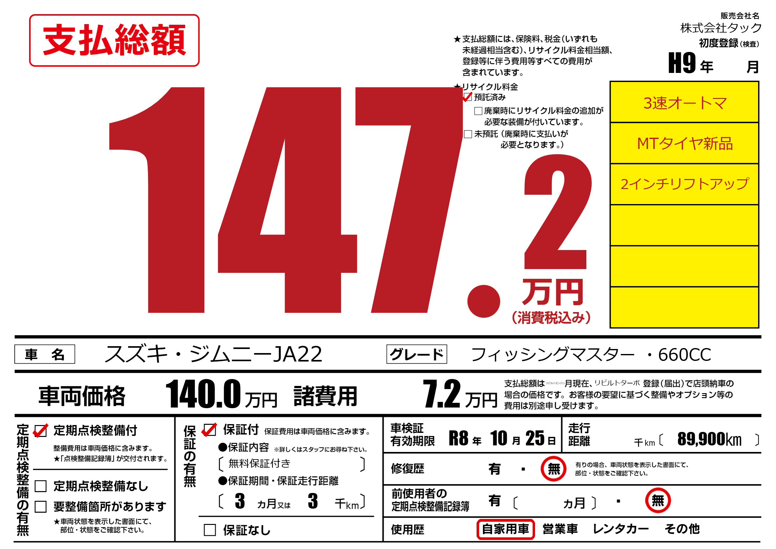 | 車名 | スズキ・ジムニーJA22 | グレード ミッション 排気量 |