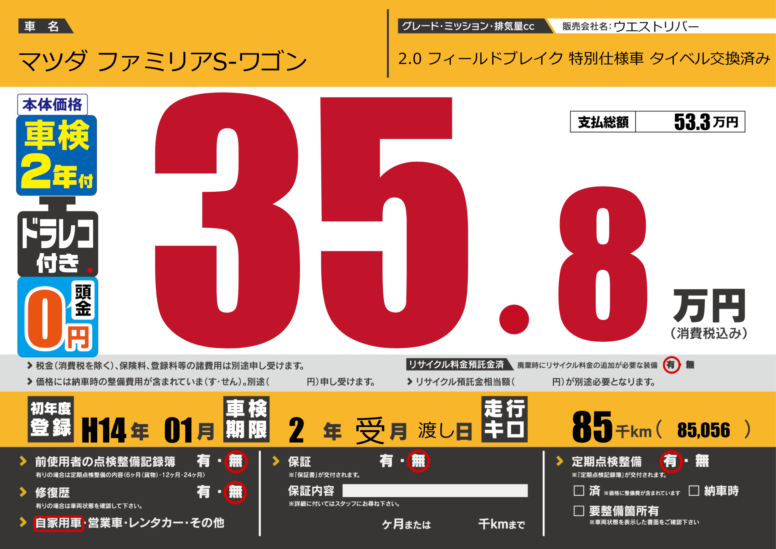 | 走行キロ | 8.5万km | 初年度登録 | H14年01月 |
