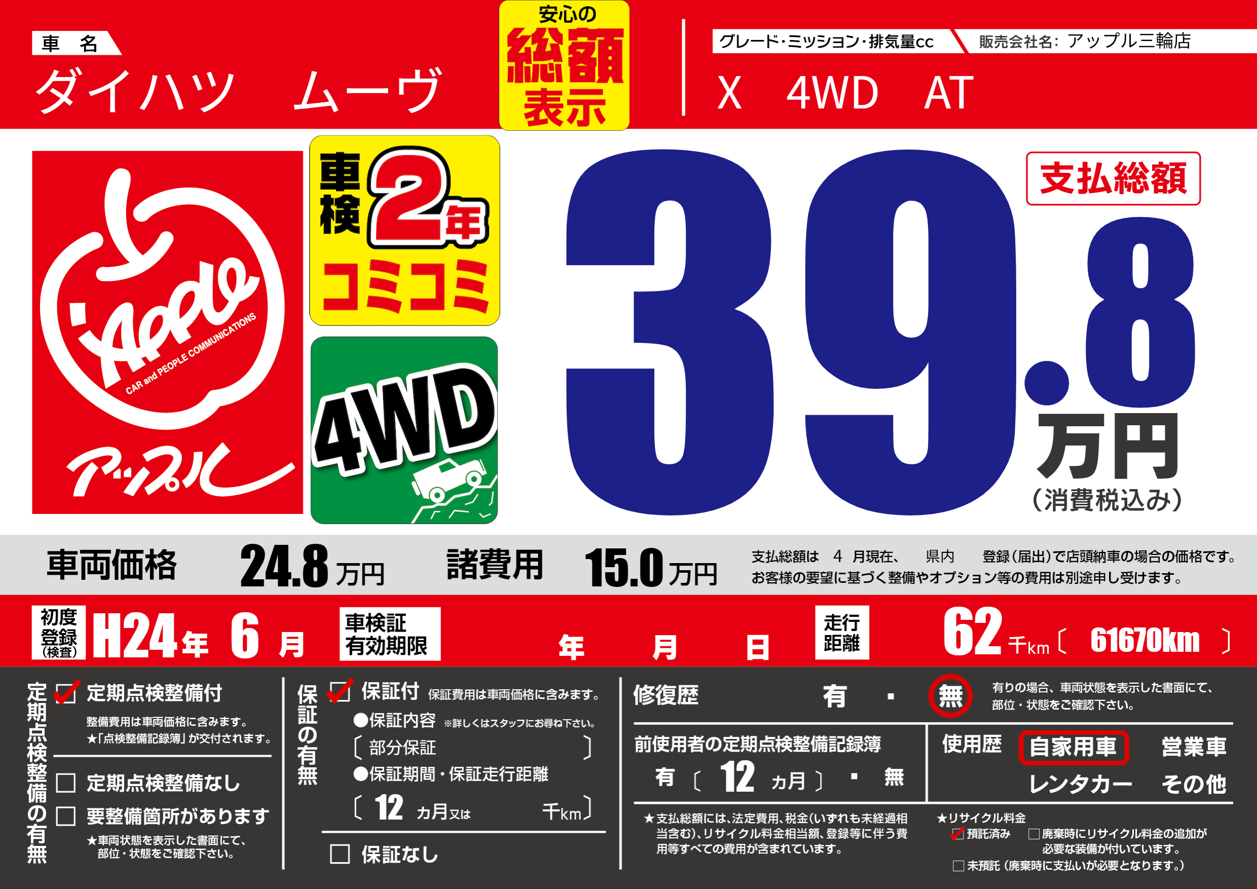 保証付き 保証内容(部分保証) 12ヶ月または()千kmまで |