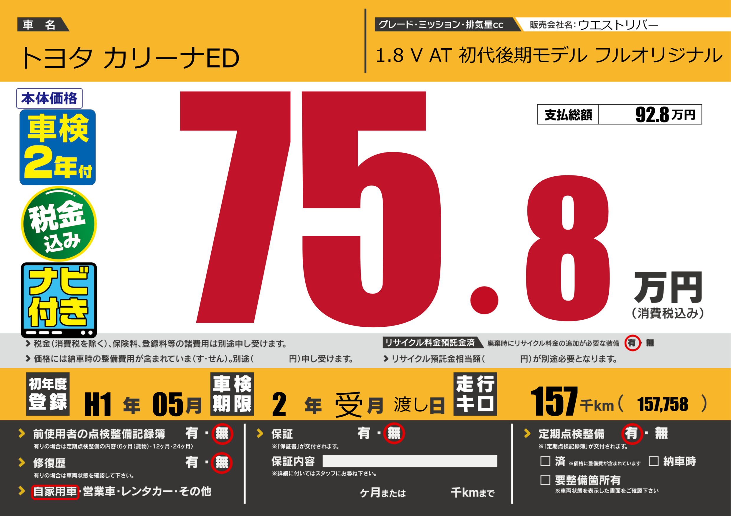 | 車名 | トヨタ カリーナED | グレード ミッション 排気量 |