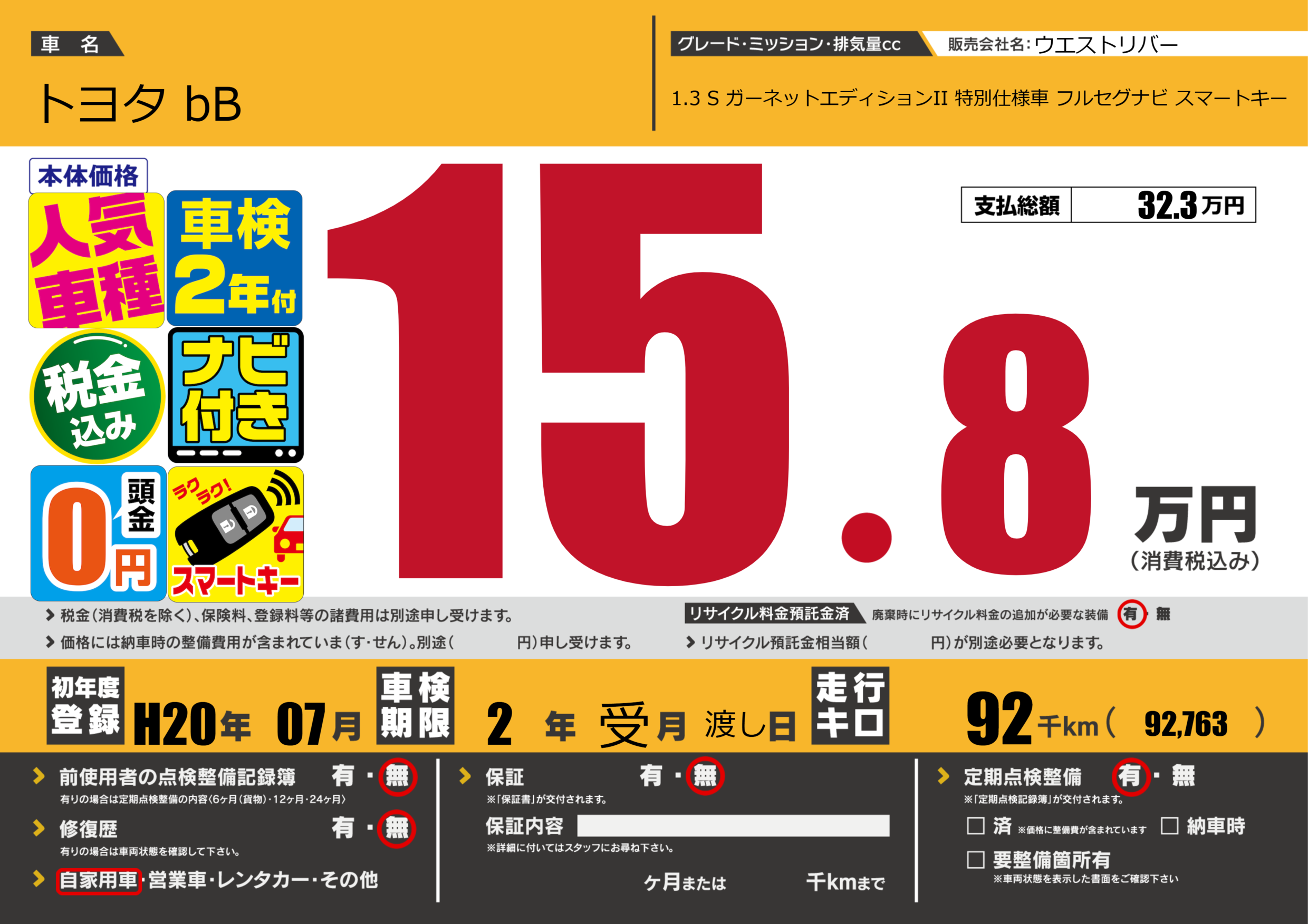 | 車名 | トヨタ bB | グレード ミッション 排気量 |