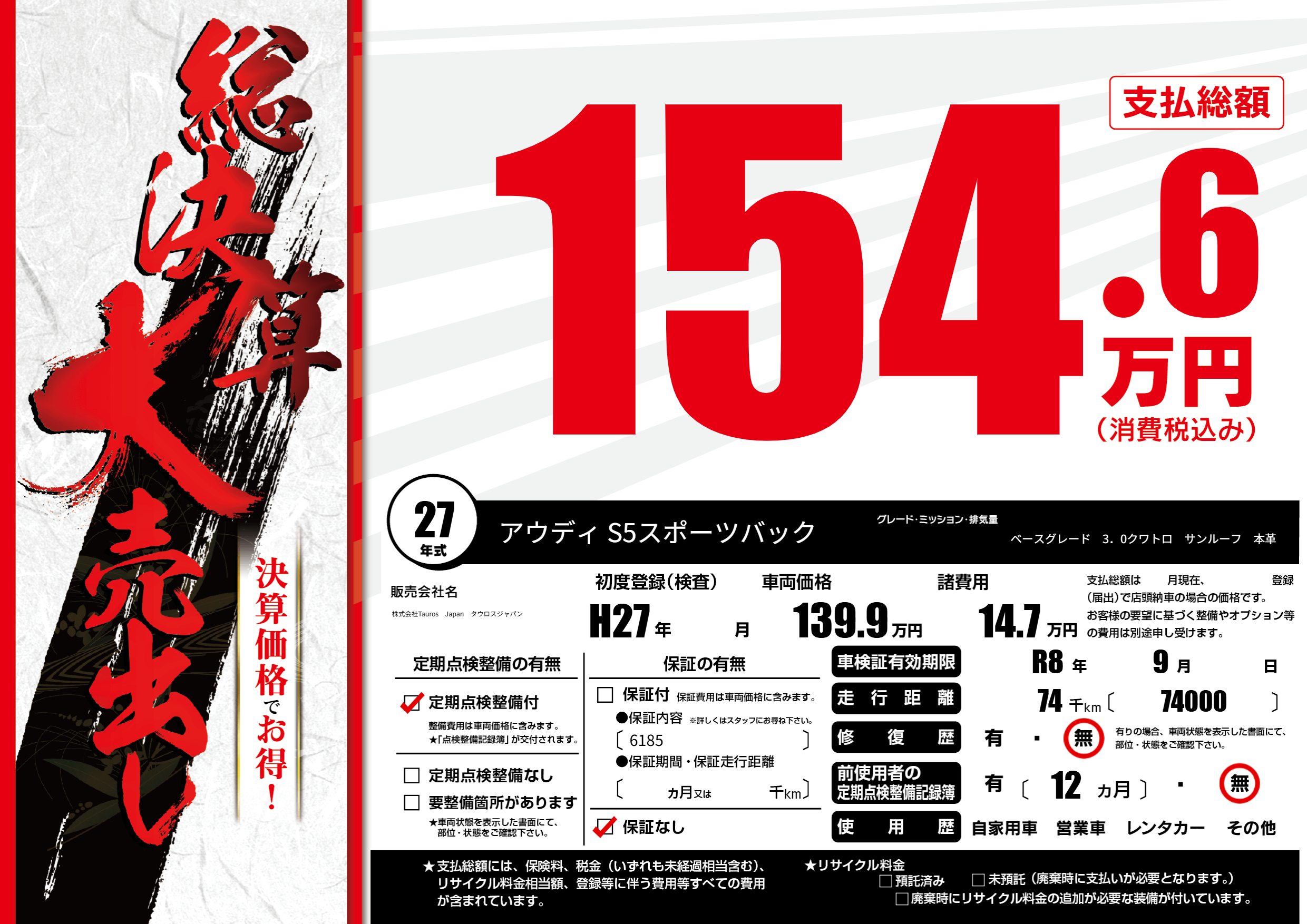 | 車名 | アウディ S5スポーツバック | グレード ミッション 排気量 |