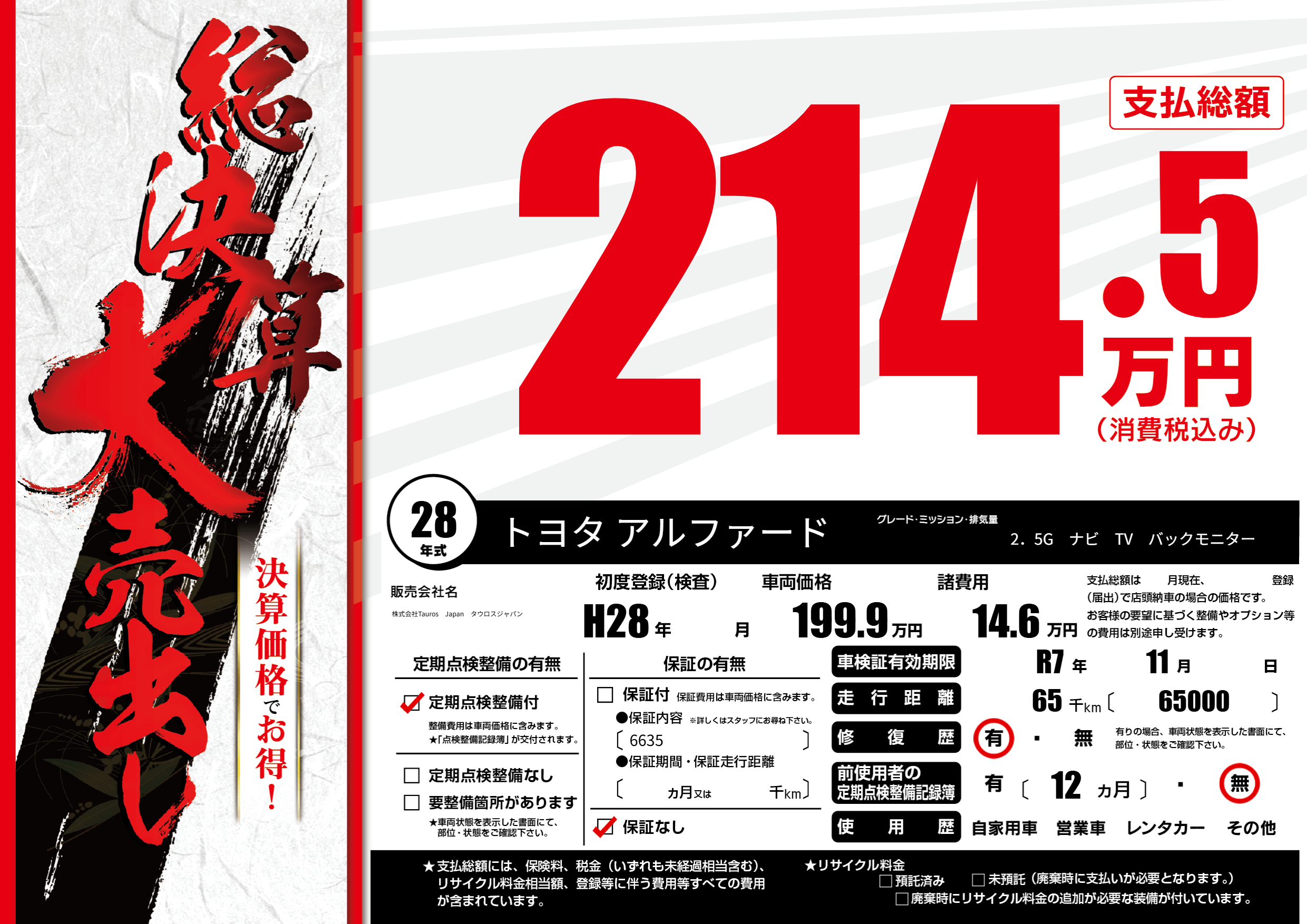 | 車名 | トヨタ アルファード | グレード ミッション 排気量 |