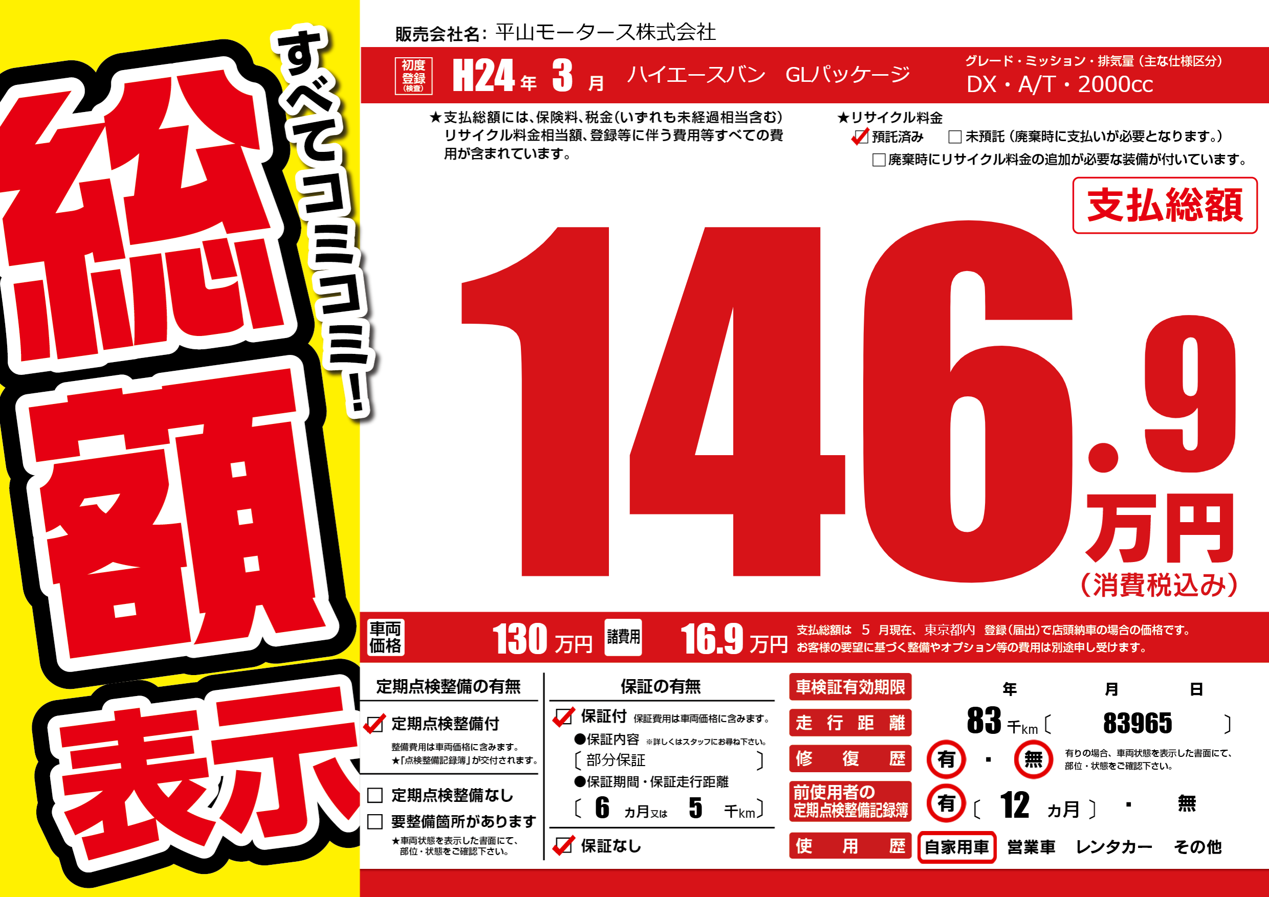 | 車名 | ハイエースバン GLパッケージ | グレード ミッション 排気量 |