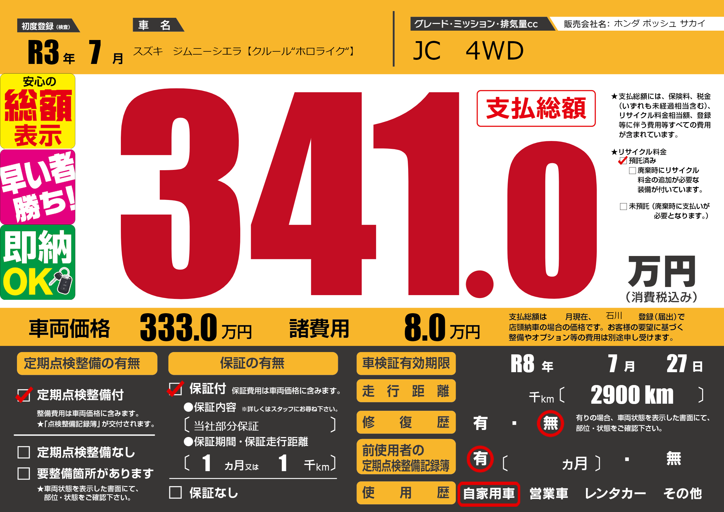 | 走行キロ | - | 初年度登録 | R3年7月 |