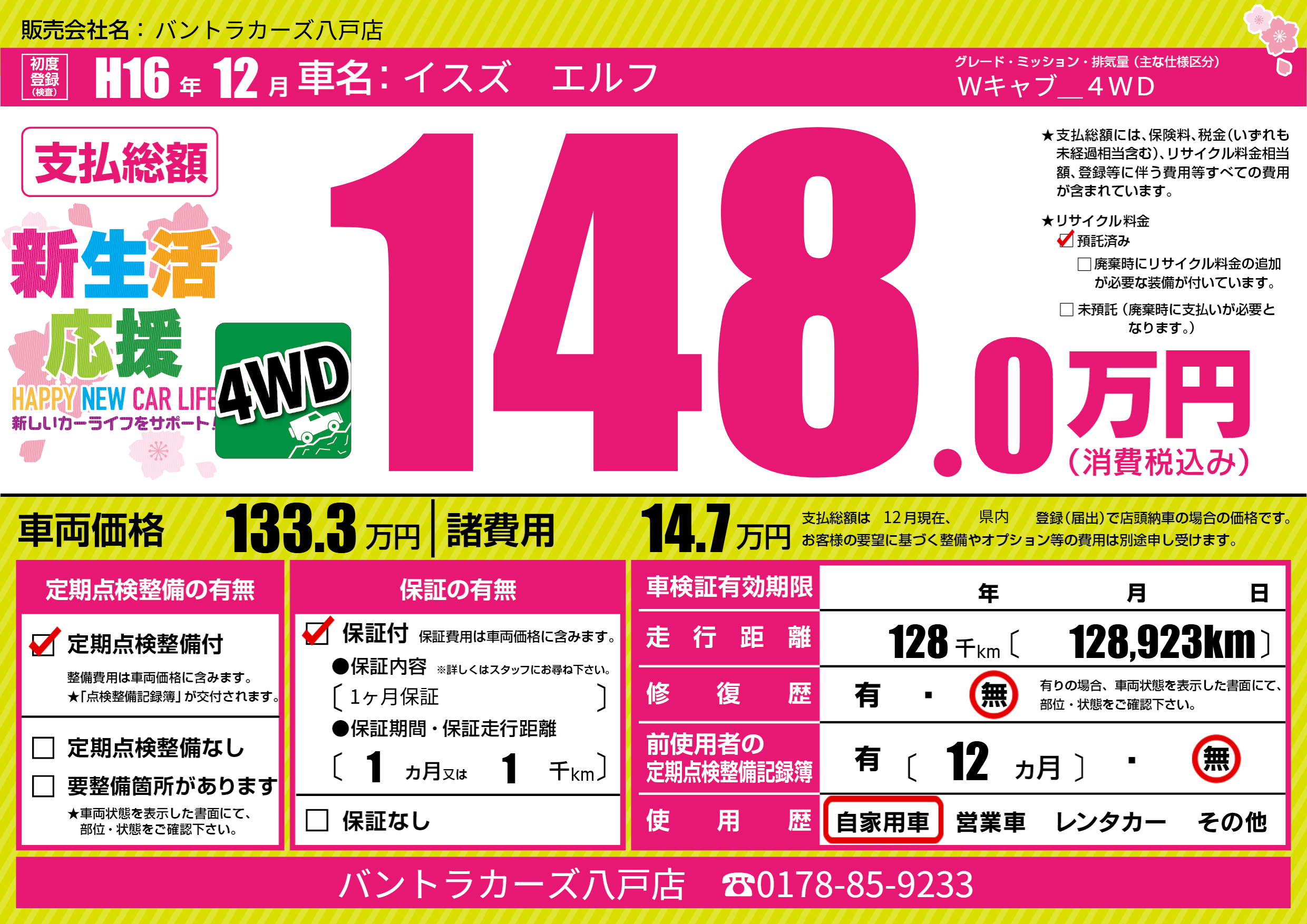 | 走行キロ | 12.8万km | 初年度登録 | H16年12月 |
