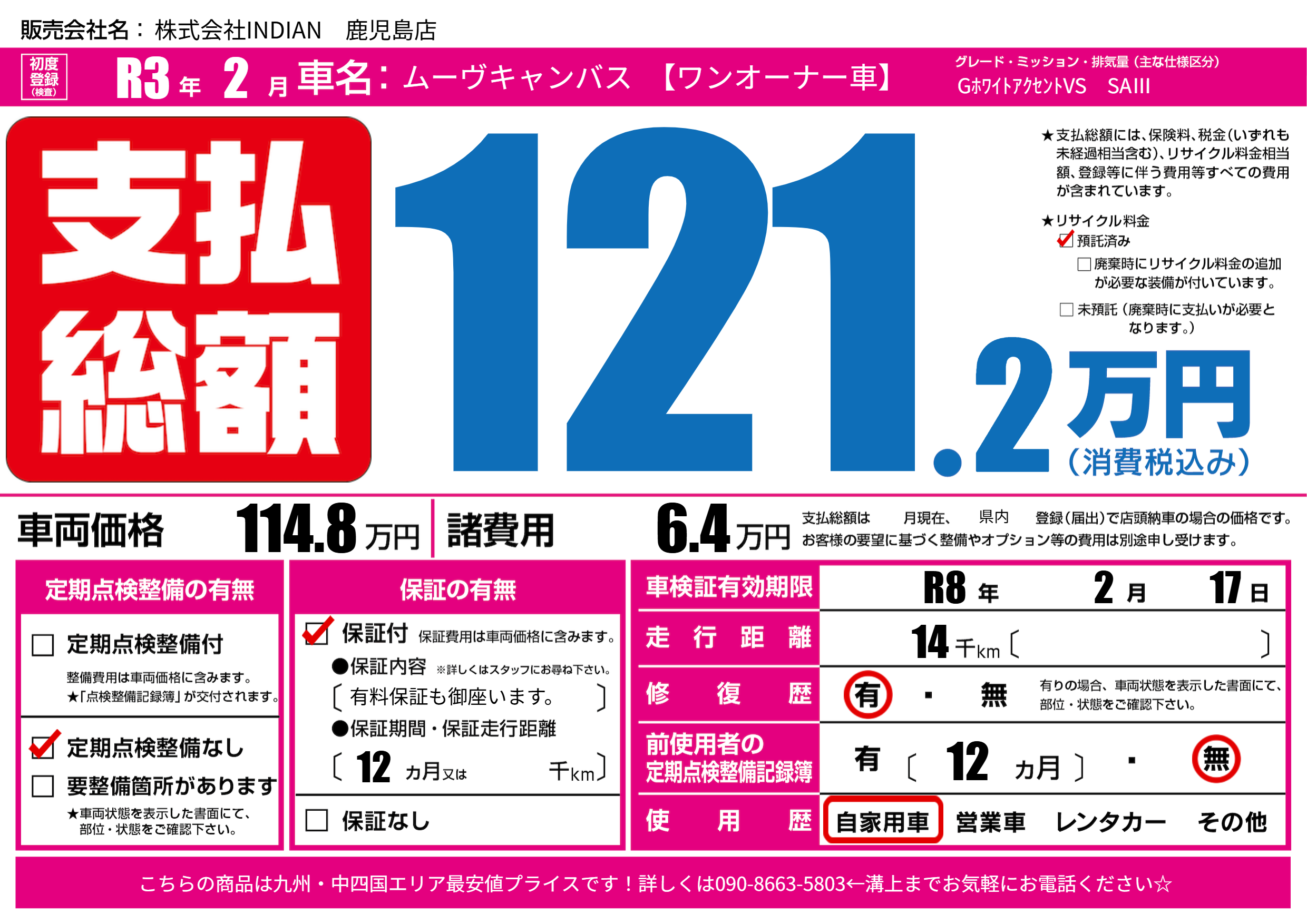 | 走行キロ | 1.4万km | 初年度登録 | R3年2月 |