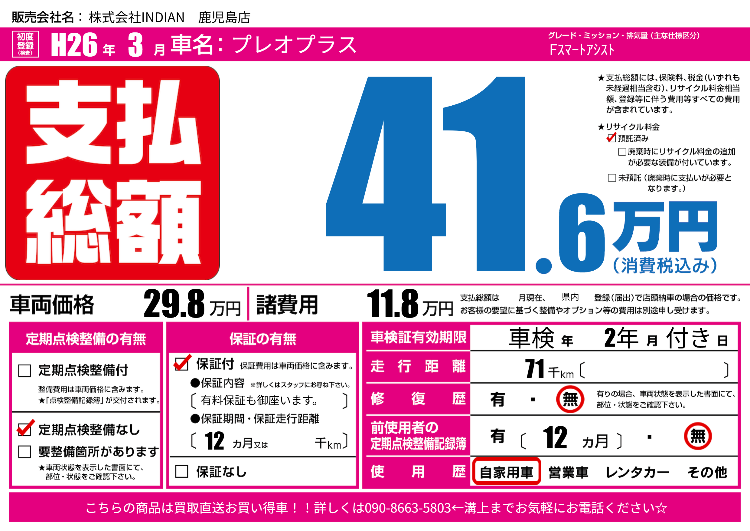 | 車名 | プレオプラス | グレード ミッション 排気量 |