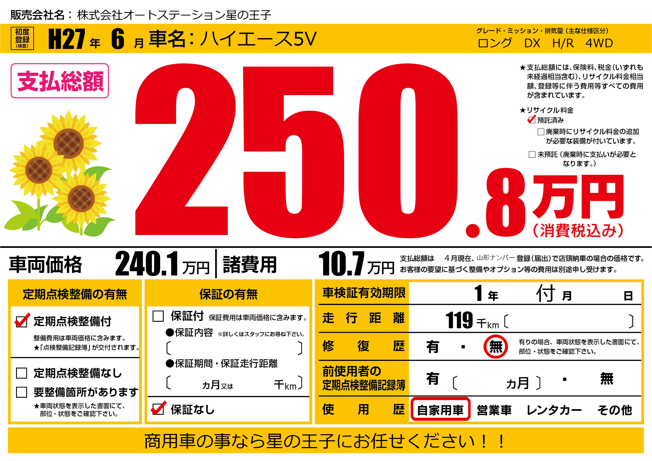 | 車名 | ハイエース5V | グレード ミッション 排気量 |
