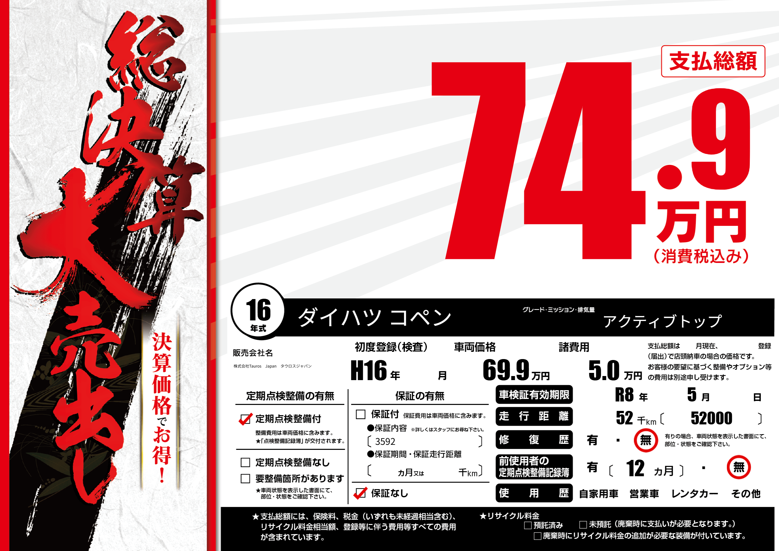 | 車名 | ダイハツ コペン | グレード ミッション 排気量 |