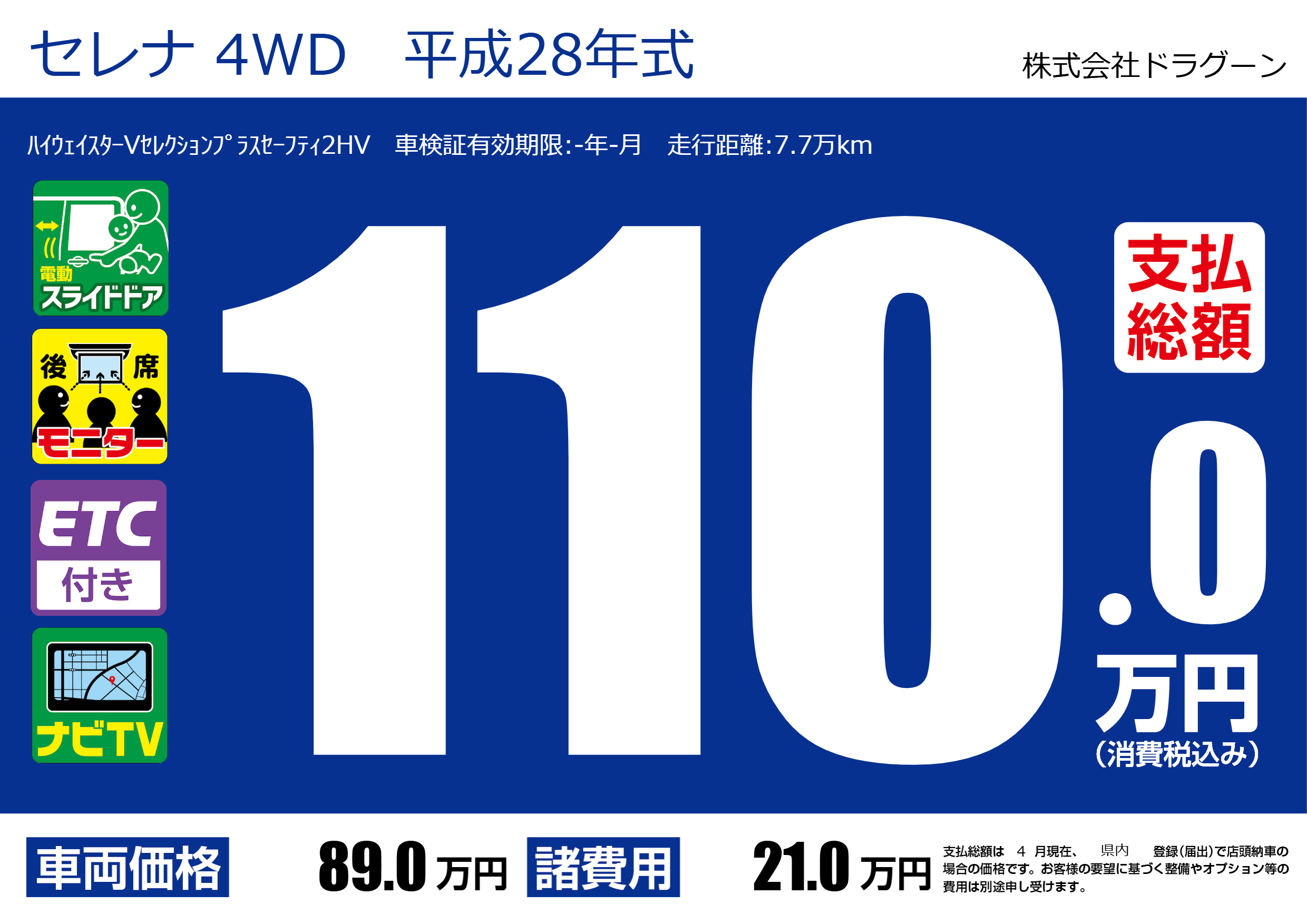 | 車名 | セレナ 4WD 平成28年式 | グレード ミッション 排気量 |