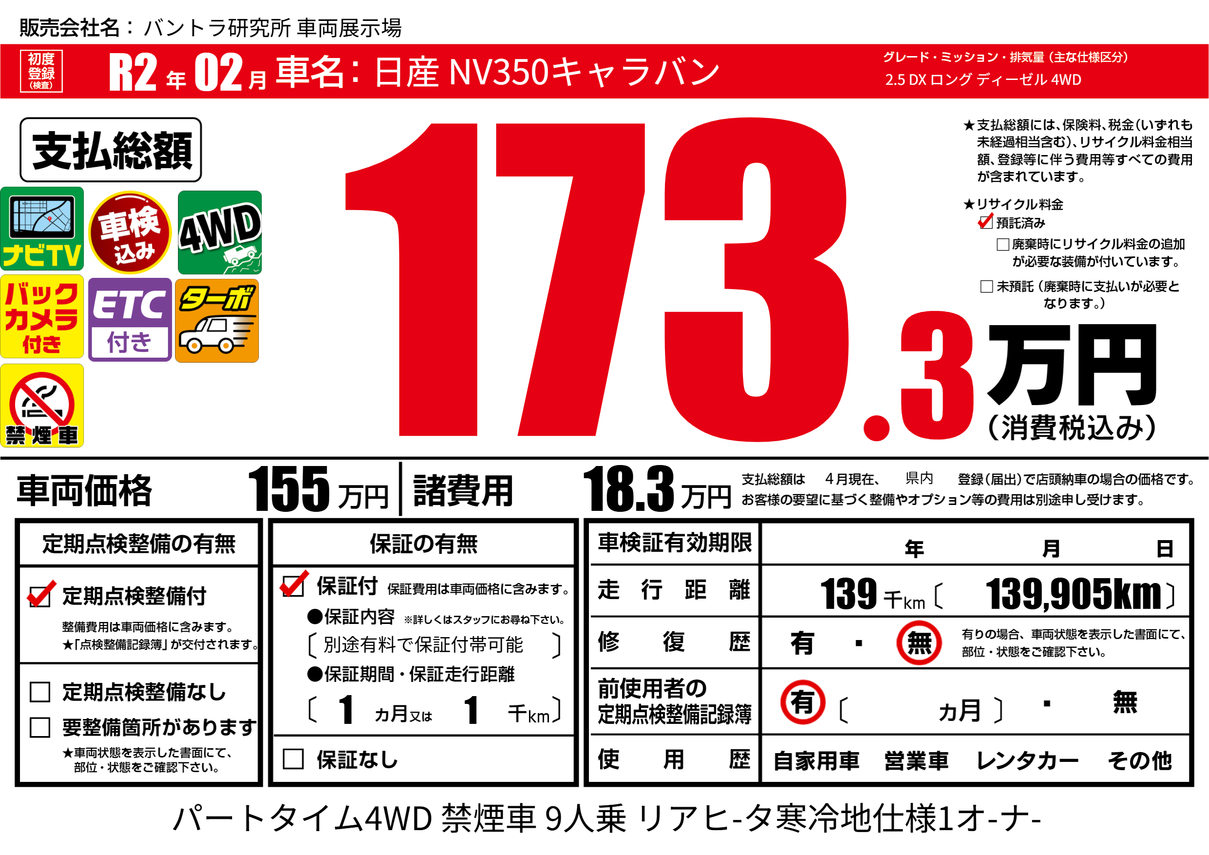 | 走行キロ | 13.9万km | 初年度登録 | R2年02月 |