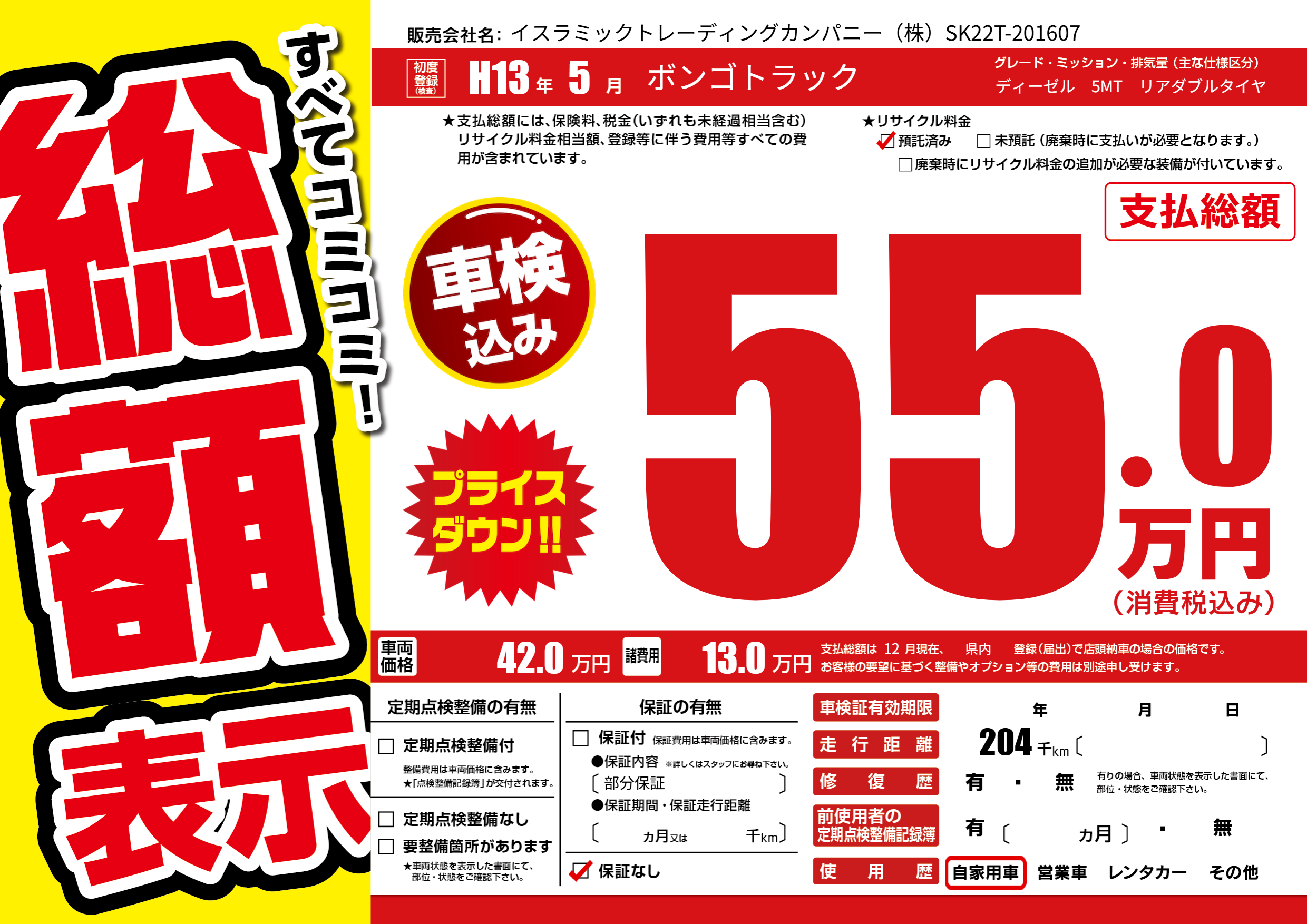 | 走行キロ | 20.4万km | 初年度登録 | H13年5月 |