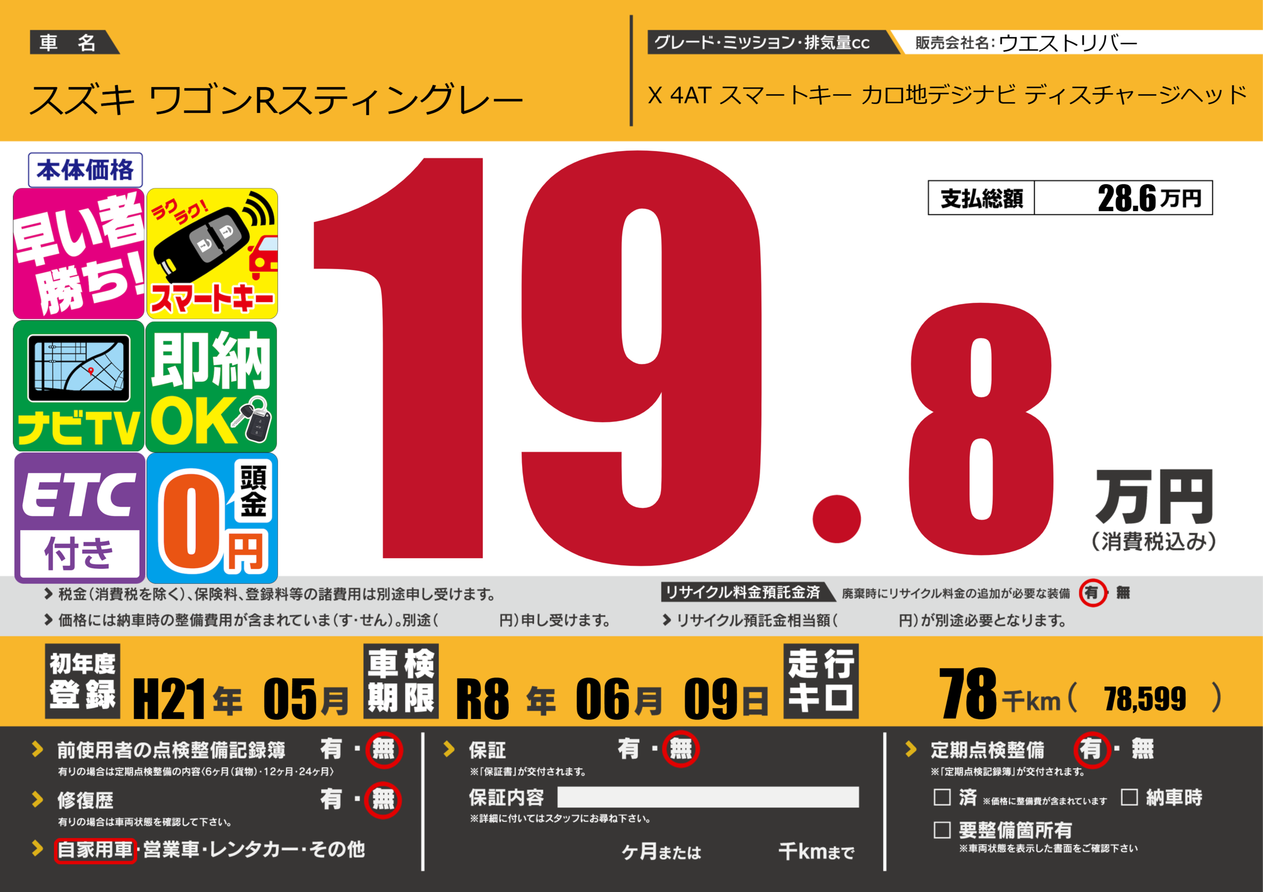 | 走行キロ | 7.8万km | 初年度登録 | H21年05月 |