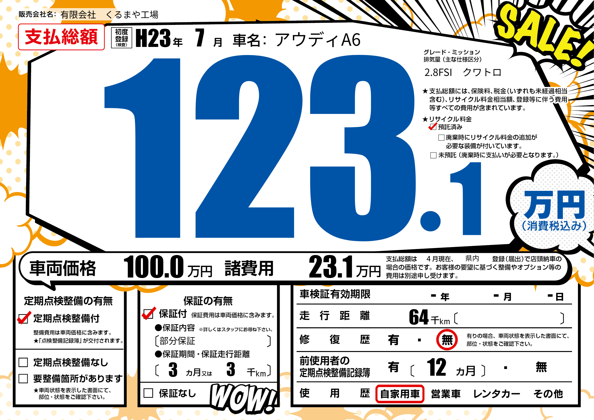 | 走行キロ | 6.4万km | 初年度登録 | H23年7月 |