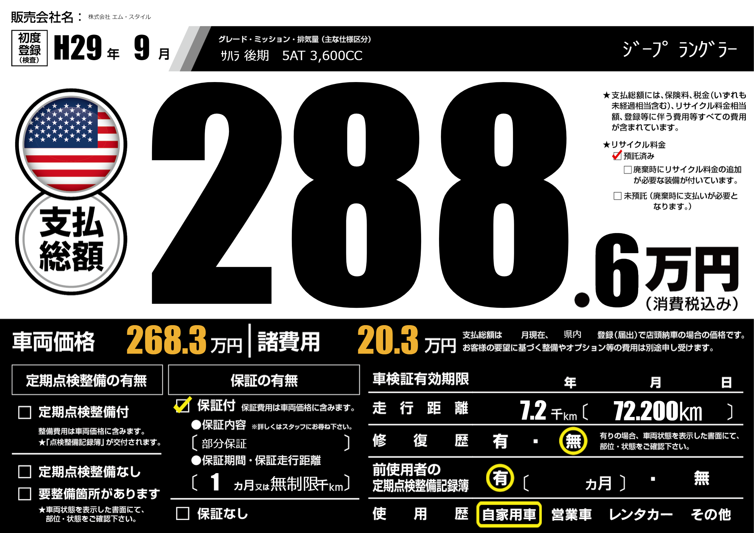 | 車名 | ジープ ラングラー | グレード ミッション 排気量 |