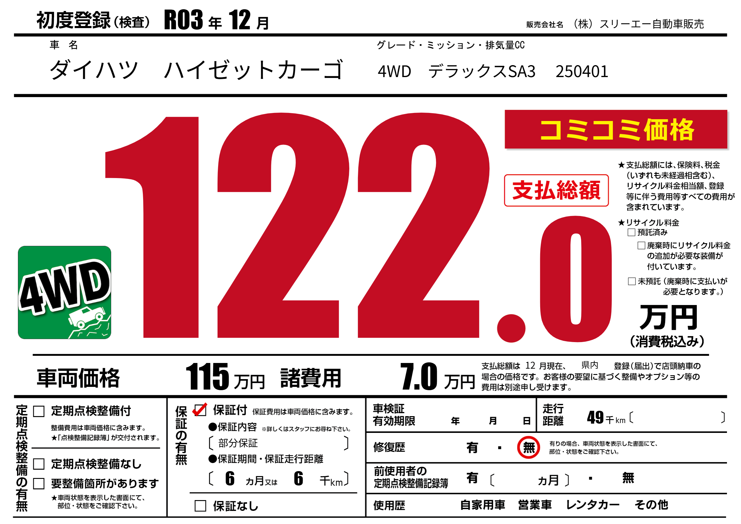 | 車名 | ダイハツ ハイゼットカーゴ | グレード ミッション 排気量 |