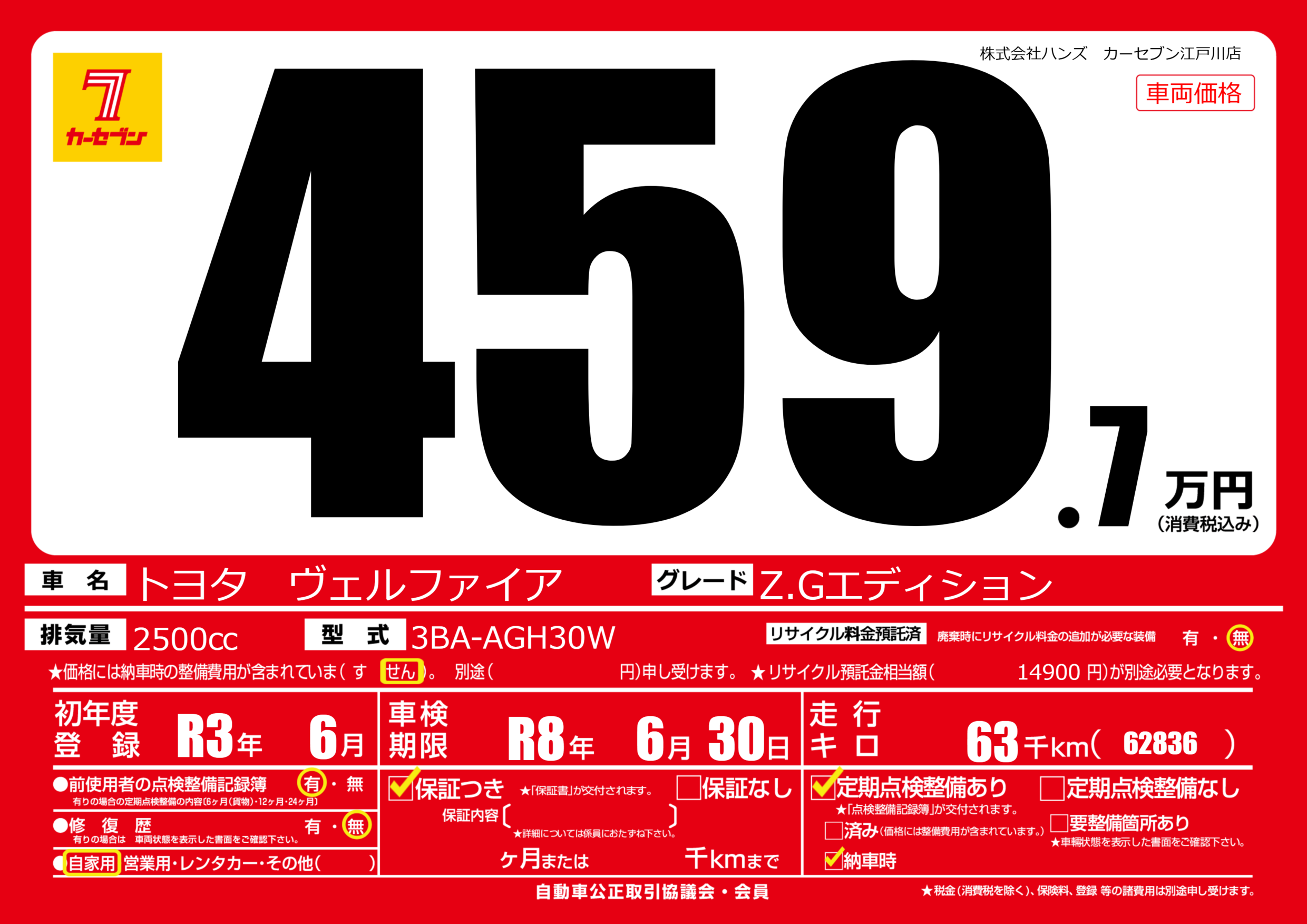 | 車名 | トヨタ ヴェルファイア | グレード ミッション 排気量 |