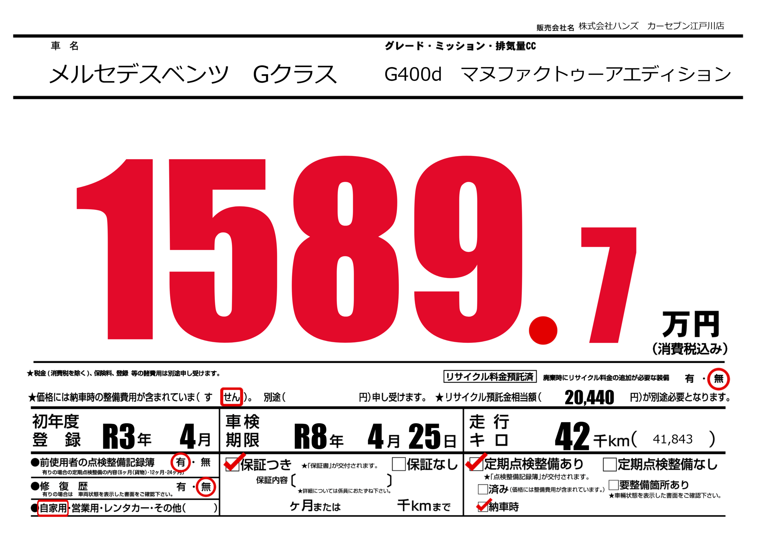 | 車名 | メルセデスベンツ Gクラス | グレード ミッション 排気量 |