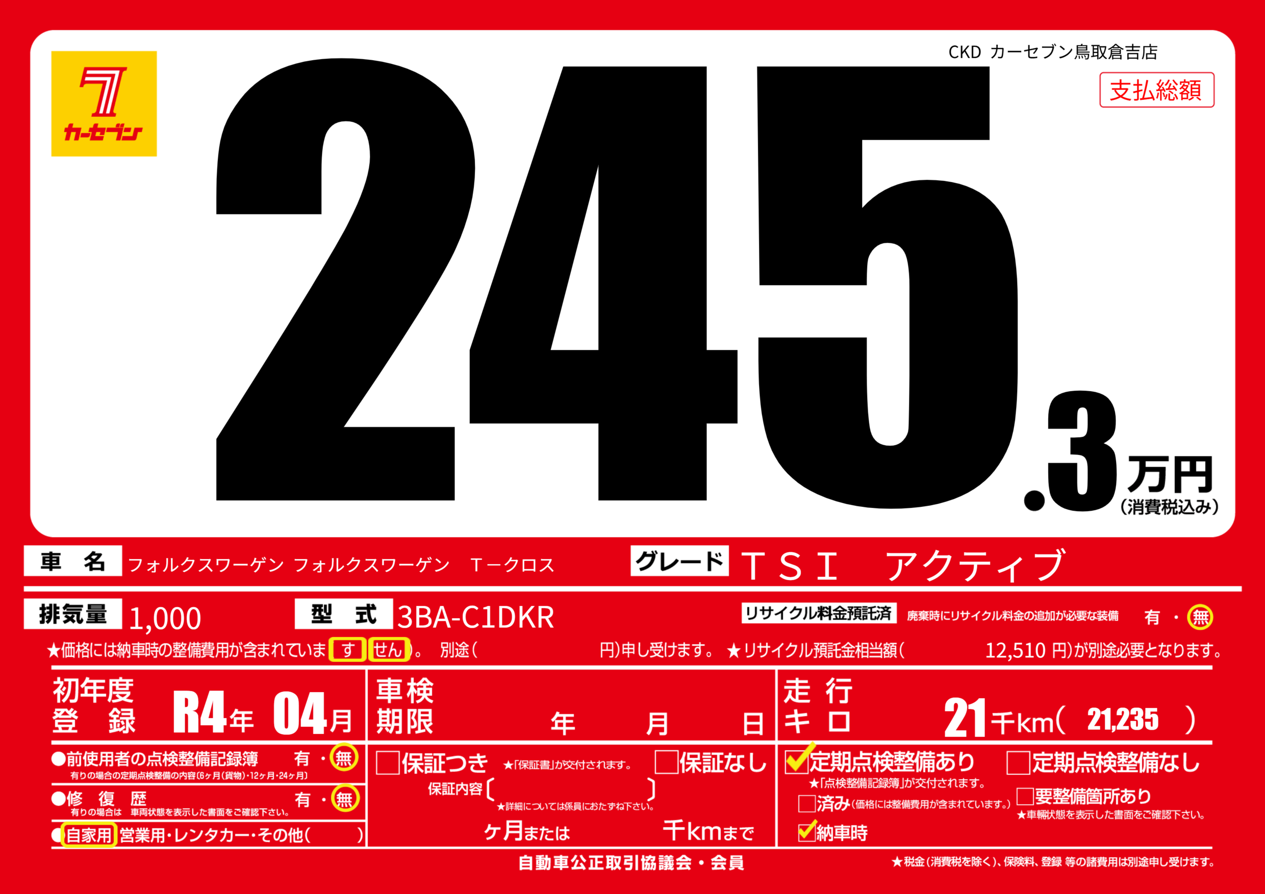 | 走行キロ | 2.1万km | 初年度登録 | R4年04月 |