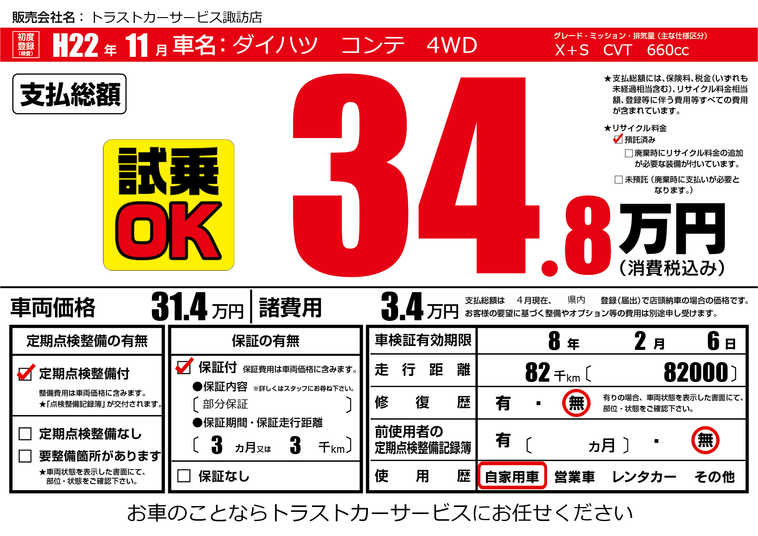 | 車名 | ダイハツ コンテ 4WD | グレード ミッション 排気量 |