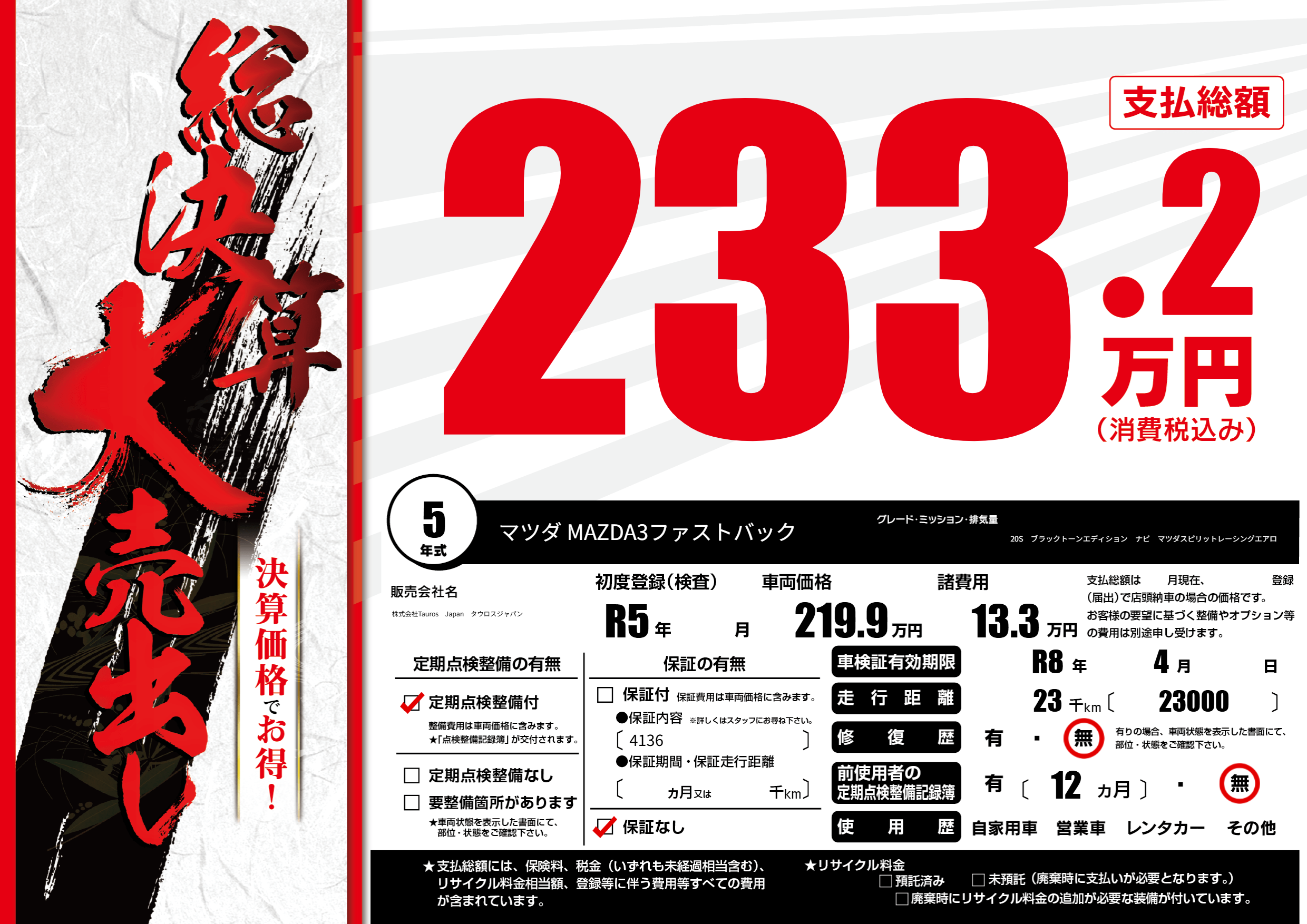 | 走行キロ | 2.3万km | 初年度登録 | R5年---月 |