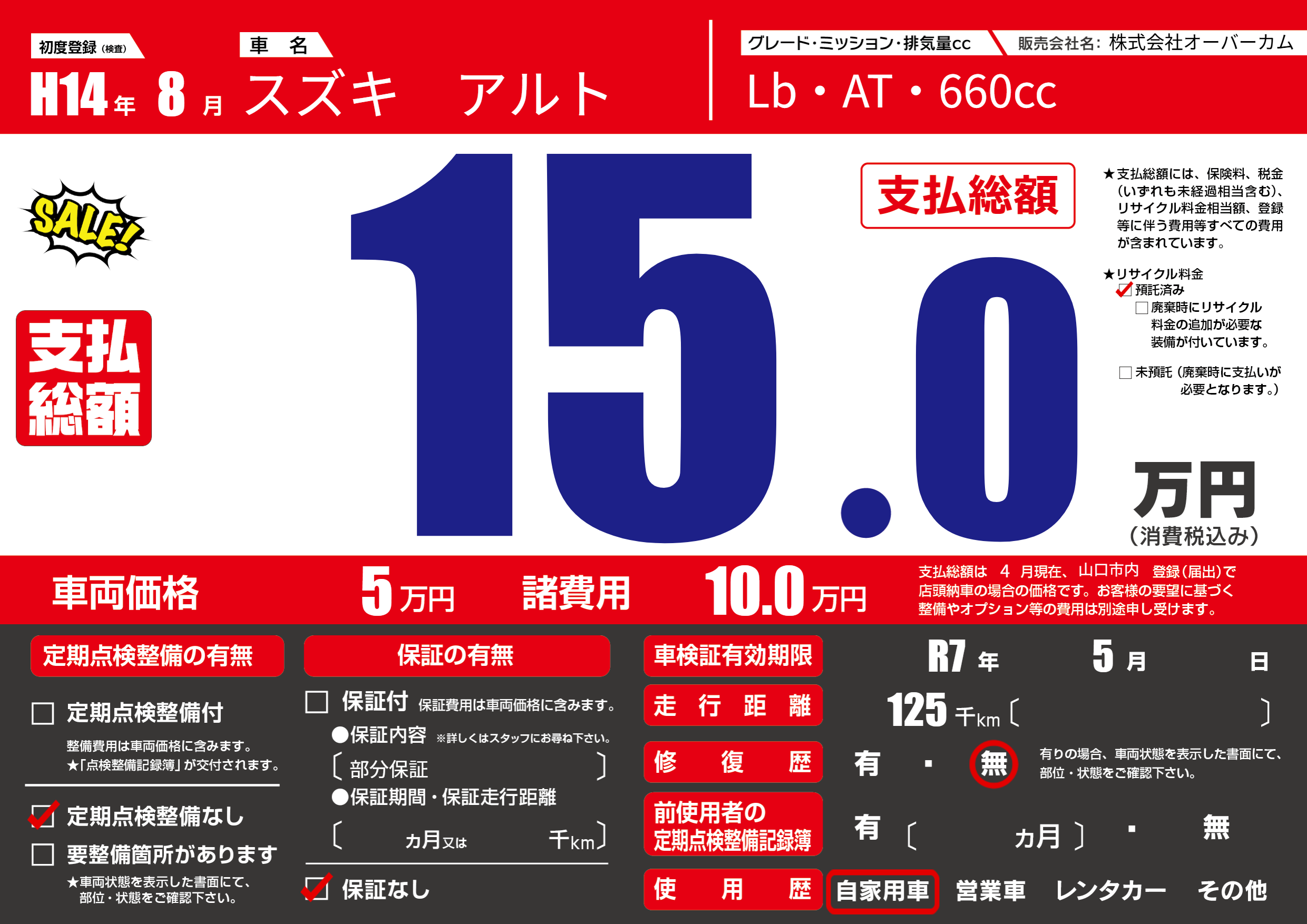 | 走行キロ | 12.5万km | 初年度登録 | H14年8月 |