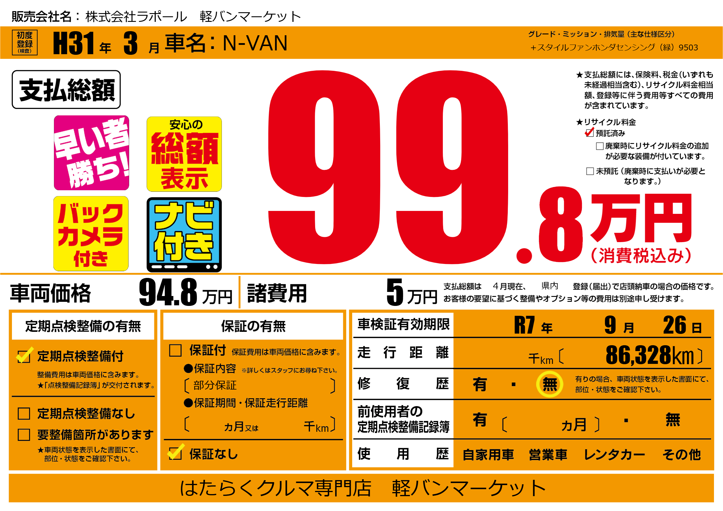 なし | 車検制限 | R7年9月26月 |