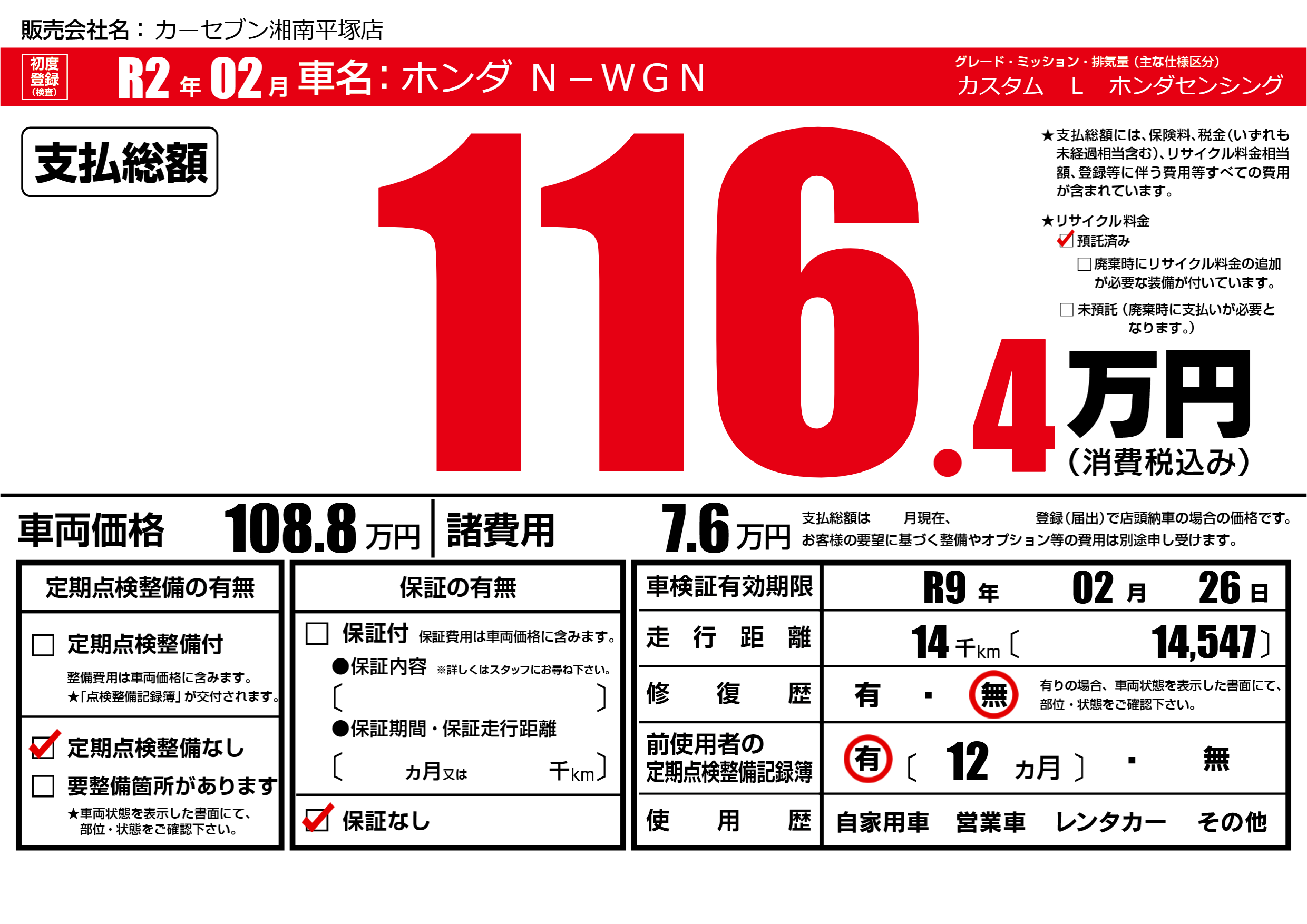 | 車名 | ホンダ N-WGN | グレード ミッション 排気量 |