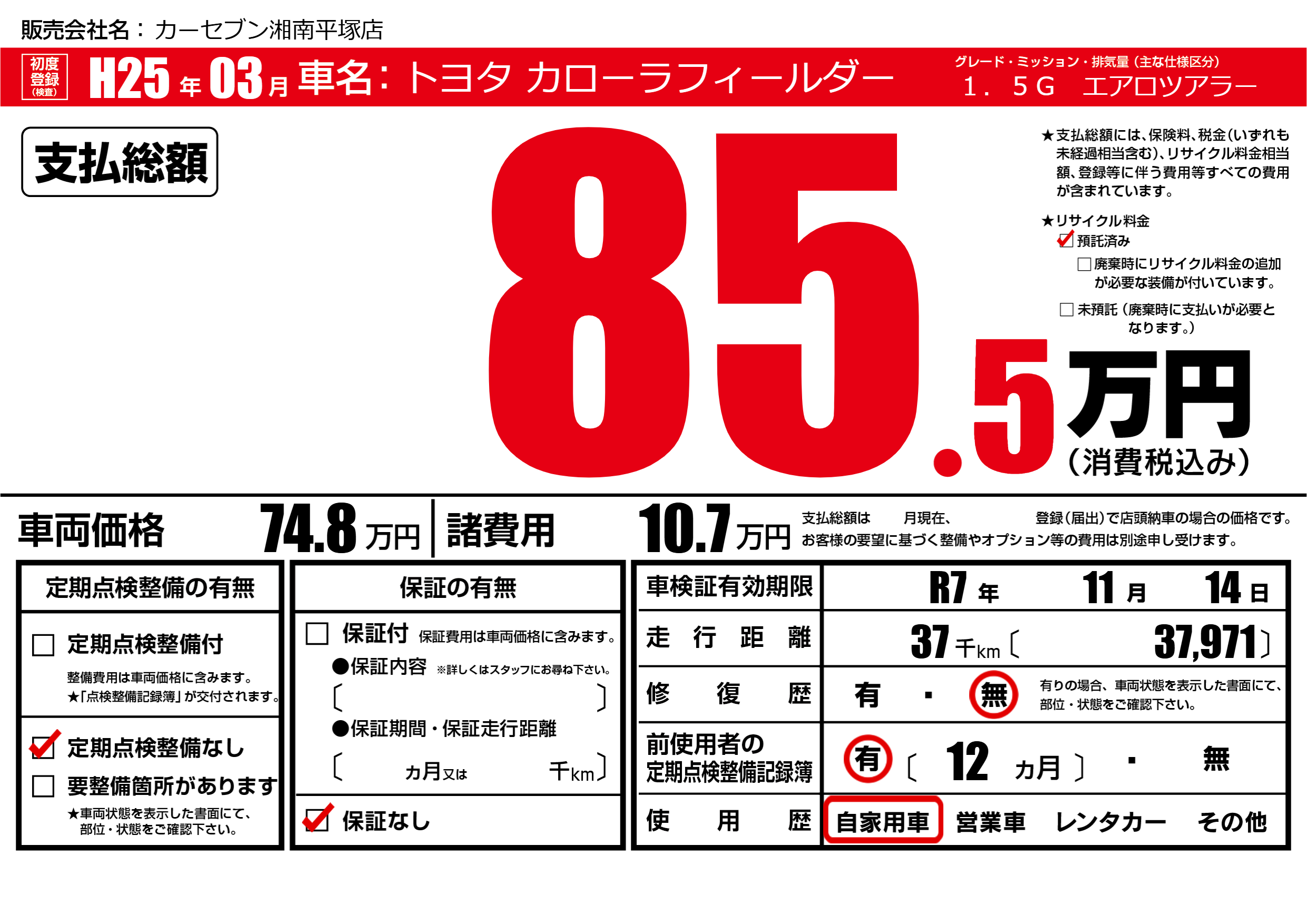 | 車名 | トヨタ カローラフィールダー | グレード ミッション 排気量 |