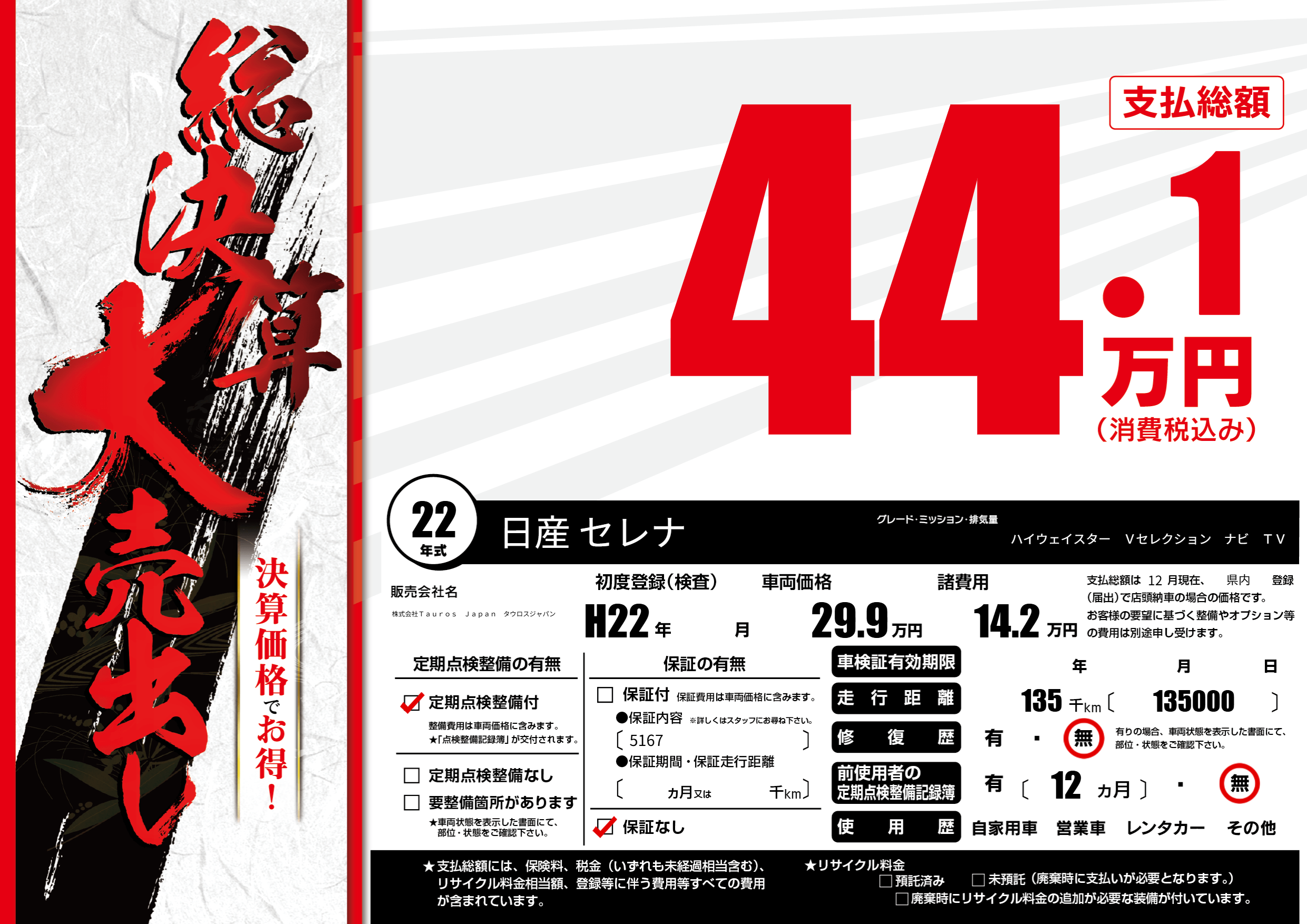 | 走行キロ | 13.5万km | 初年度登録 | H22年---月 |
