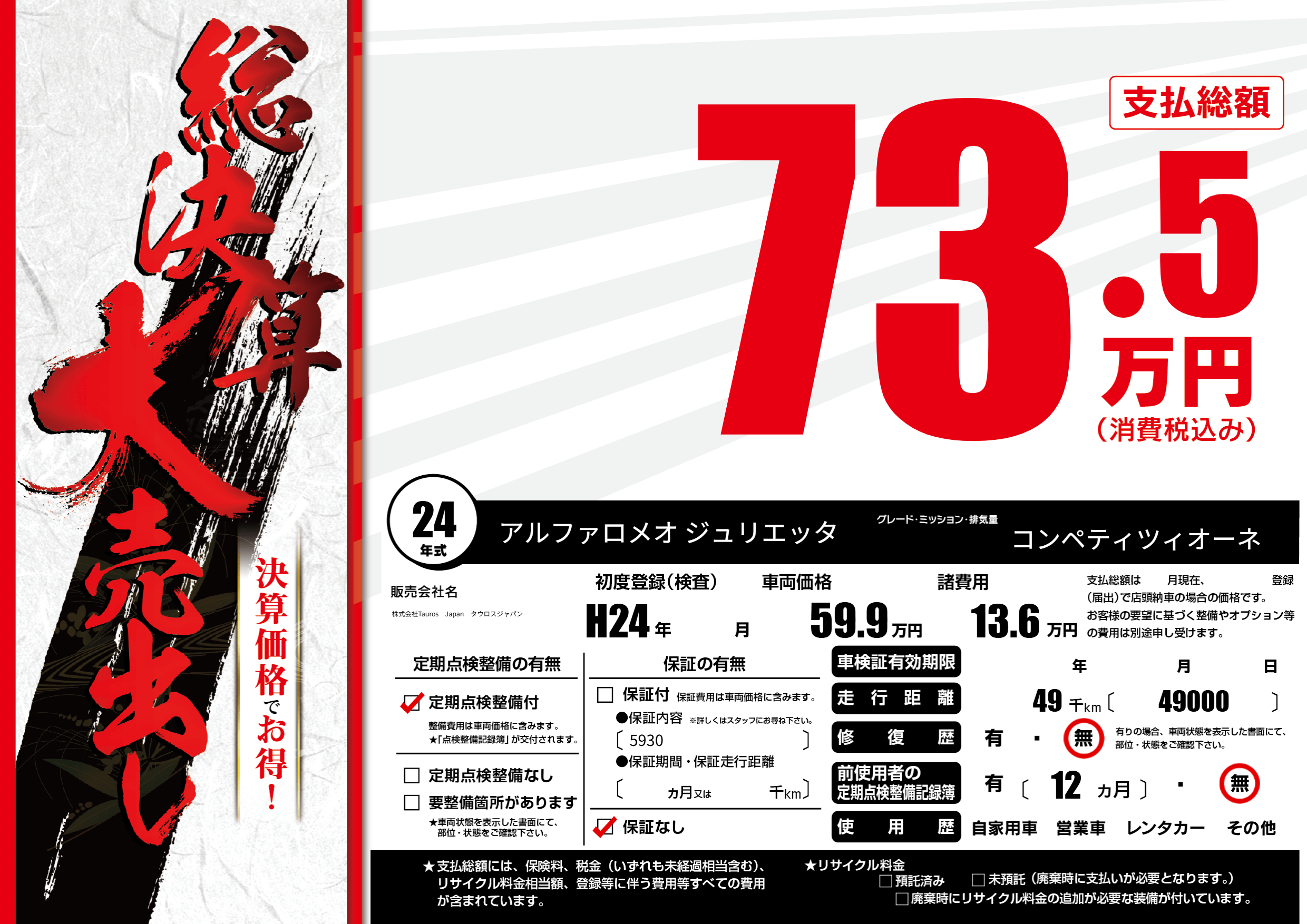| 車名 | アルファロメオ ジュリエッタ | グレード ミッション 排気量 |