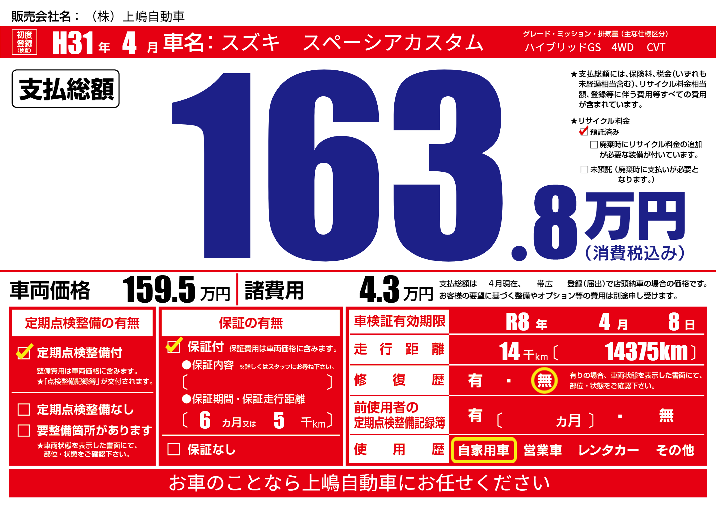 | 車名 | スズキ スペーシアカスタム | グレード ミッション 排気量 |