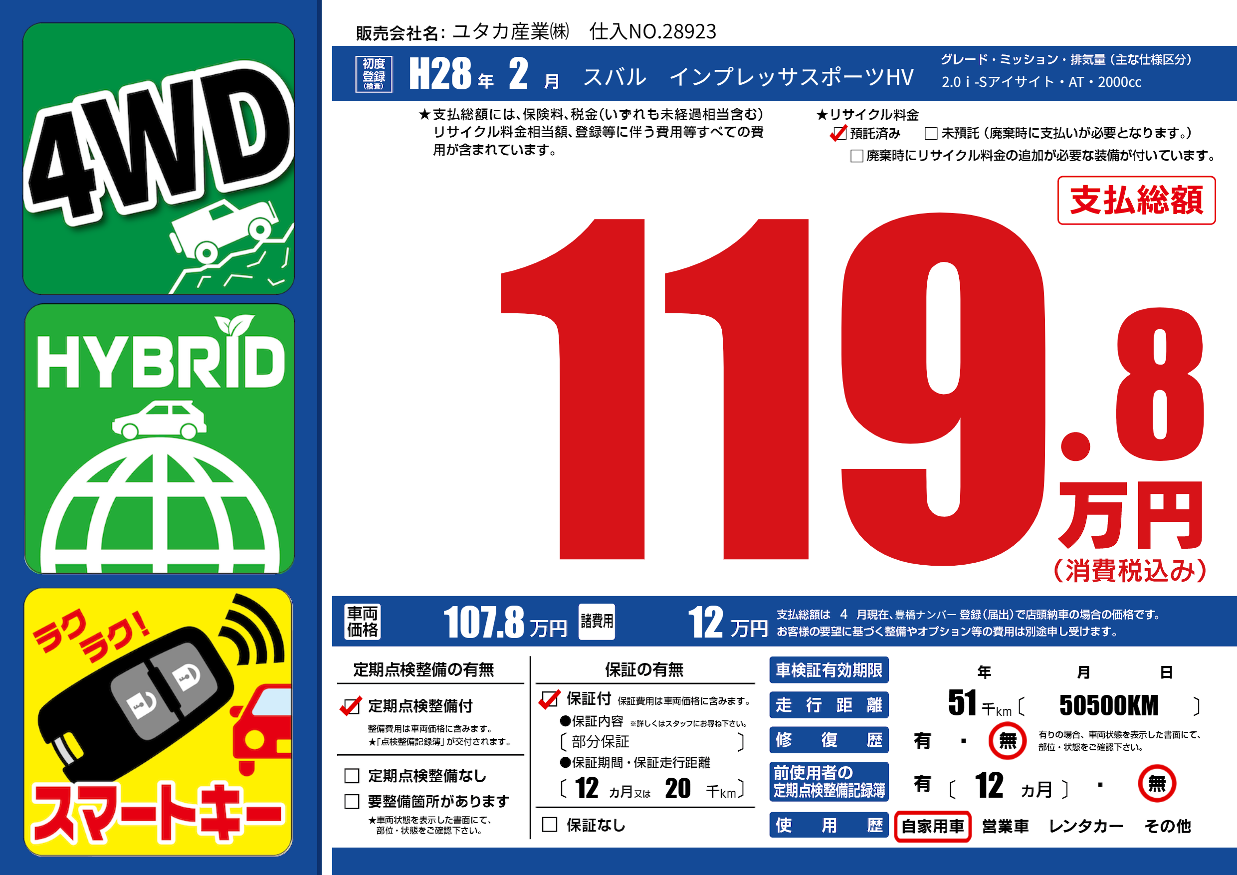 | 走行キロ | 5.1万km | 初年度登録 | H28年2月 |