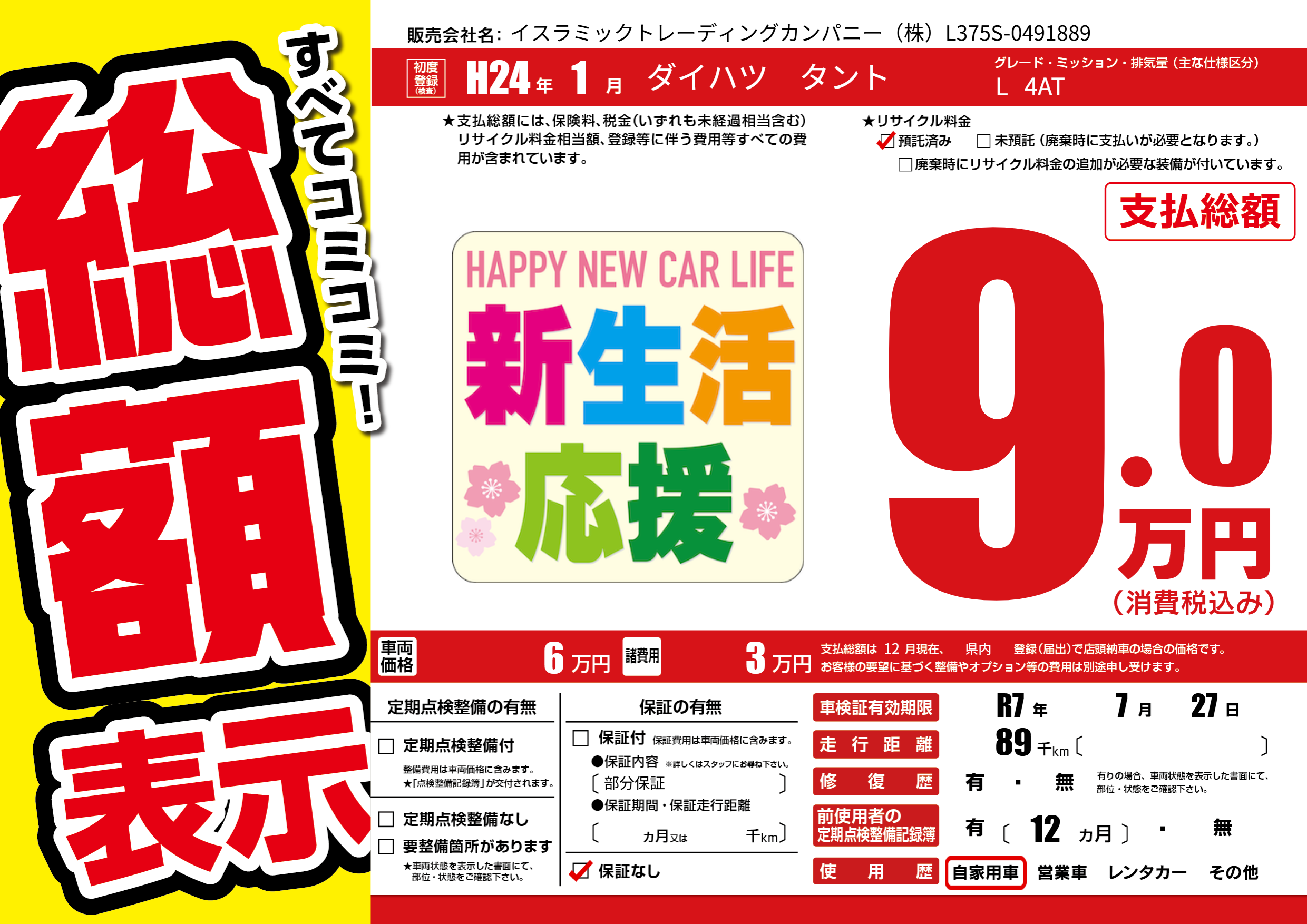 | 車名 | ダイハツ タント | グレード ミッション 排気量 |