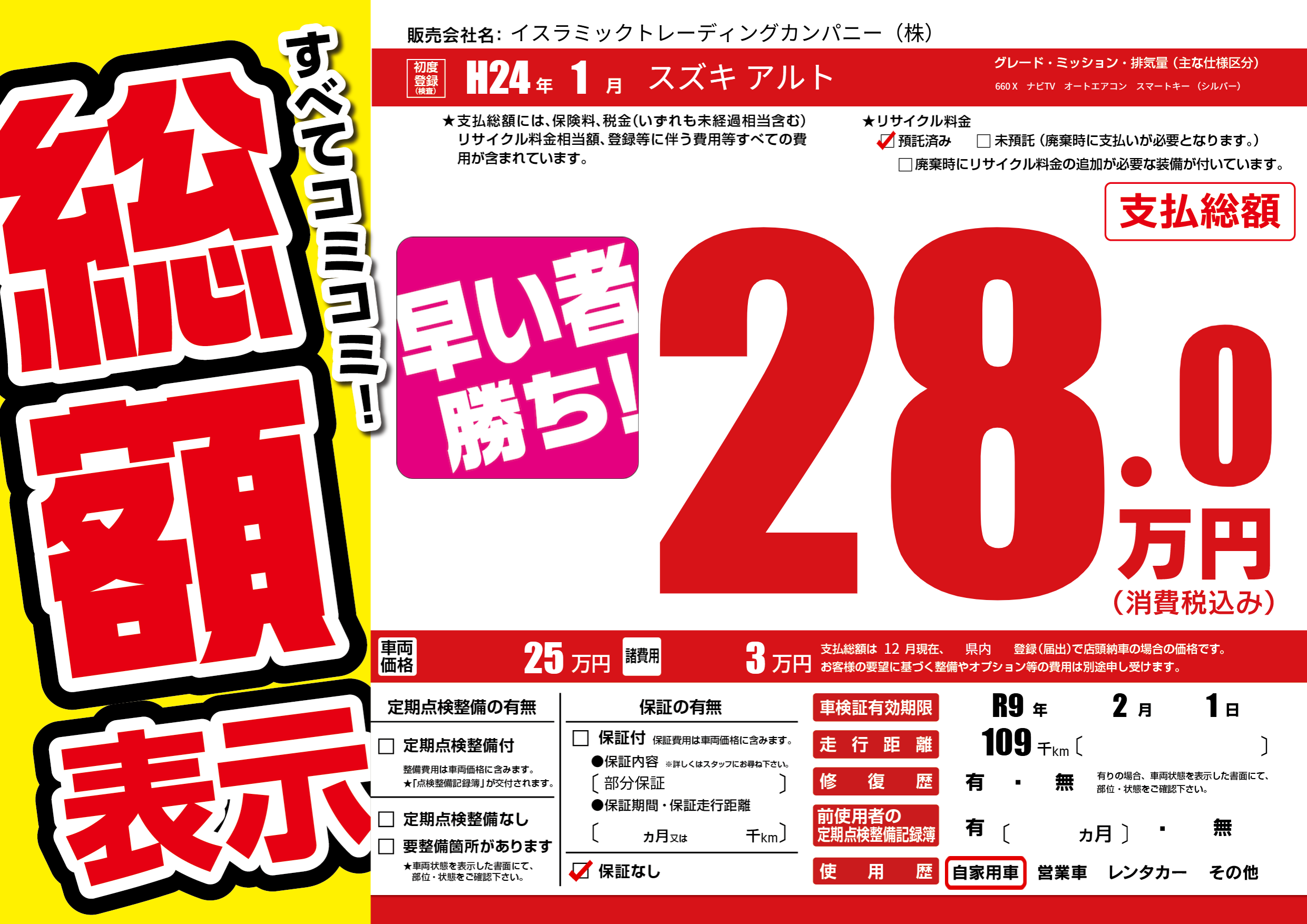 保証なし 保証内容(部分保証) ---ヶ月または()千kmまで |