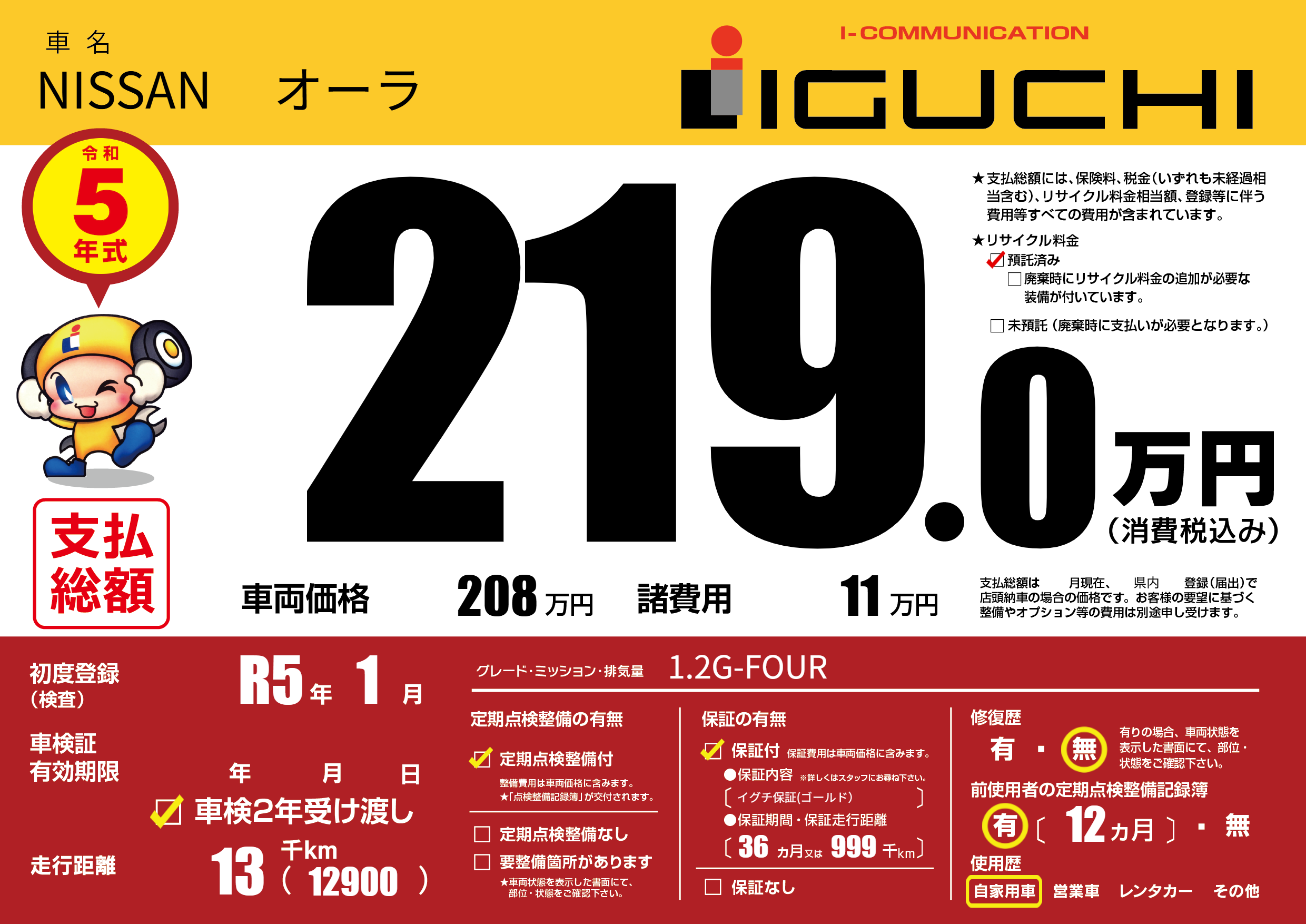 | 車名 | NISSAN オーラ | グレード ミッション 排気量 |