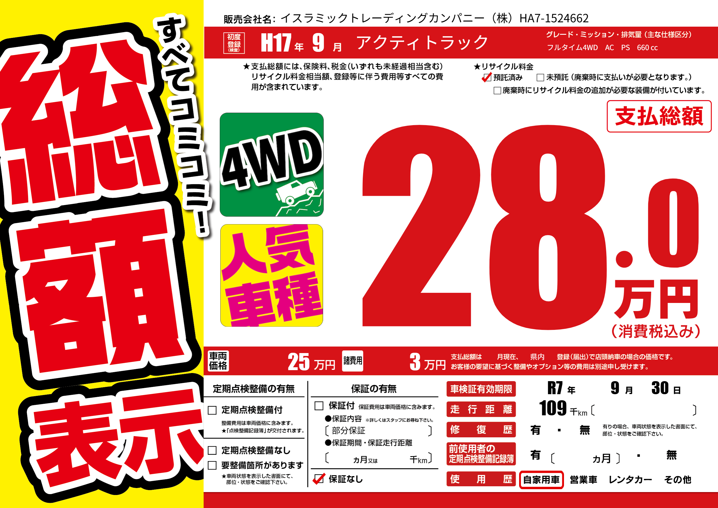 | 車検制限 | R7年 9月 30日 | ||