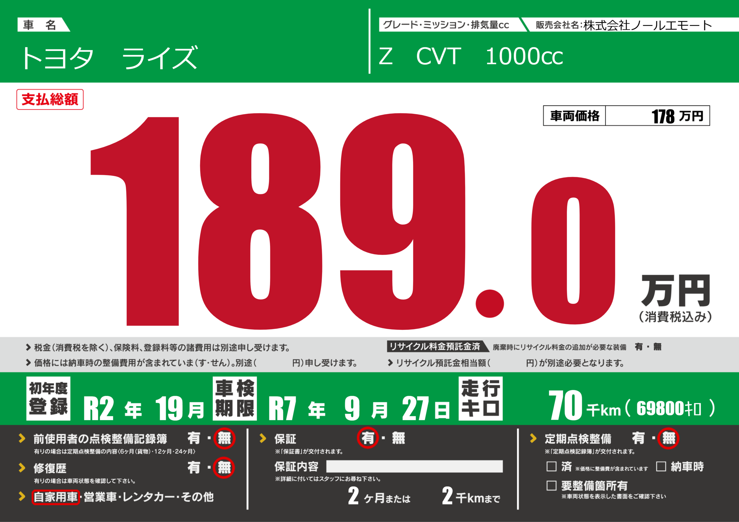 | 車名 | トヨタ ライズ | グレード ミッション 排気量 |