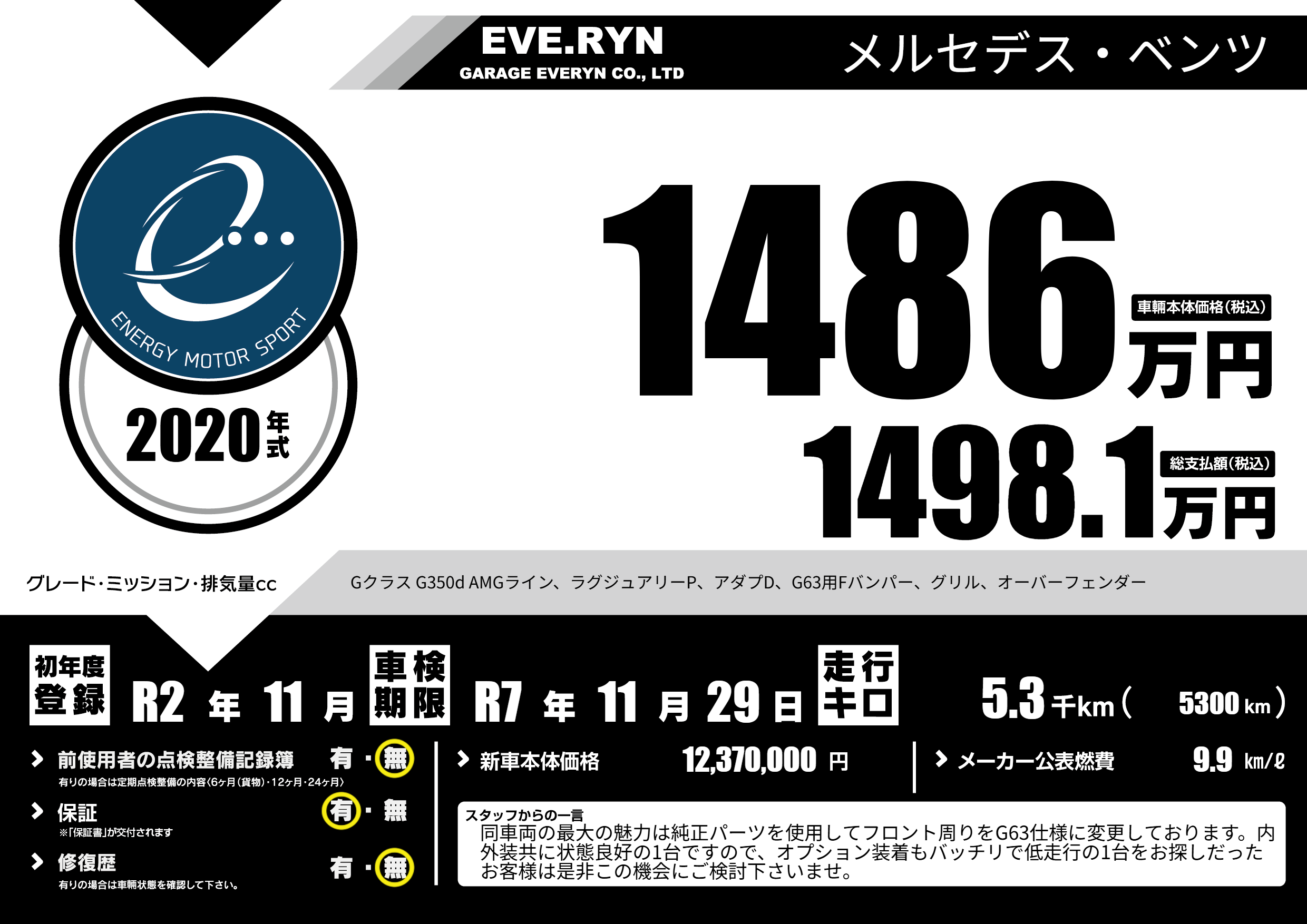 Gクラス G350d AMGライン、ラグジュアリーP、アダプD、G63用Fバンパー、グリル、オーバーフェンダー |